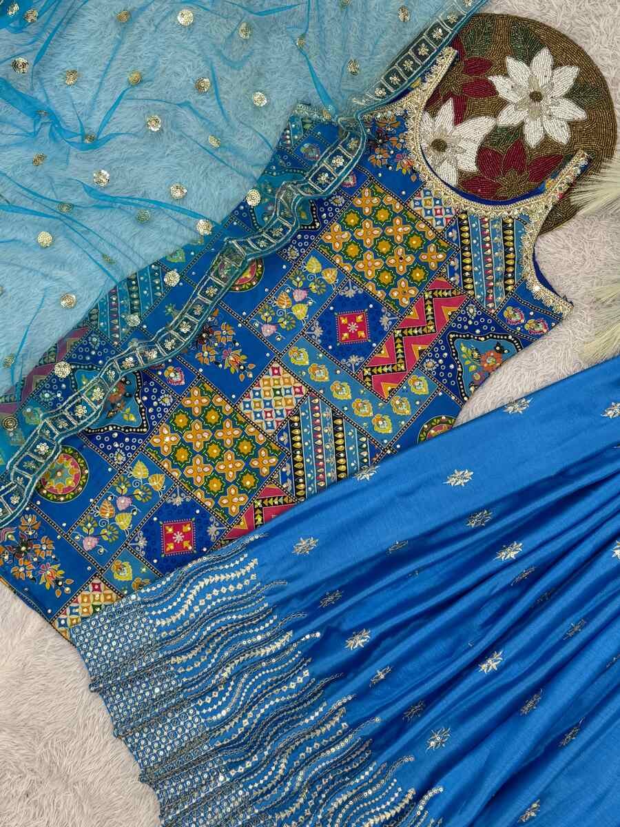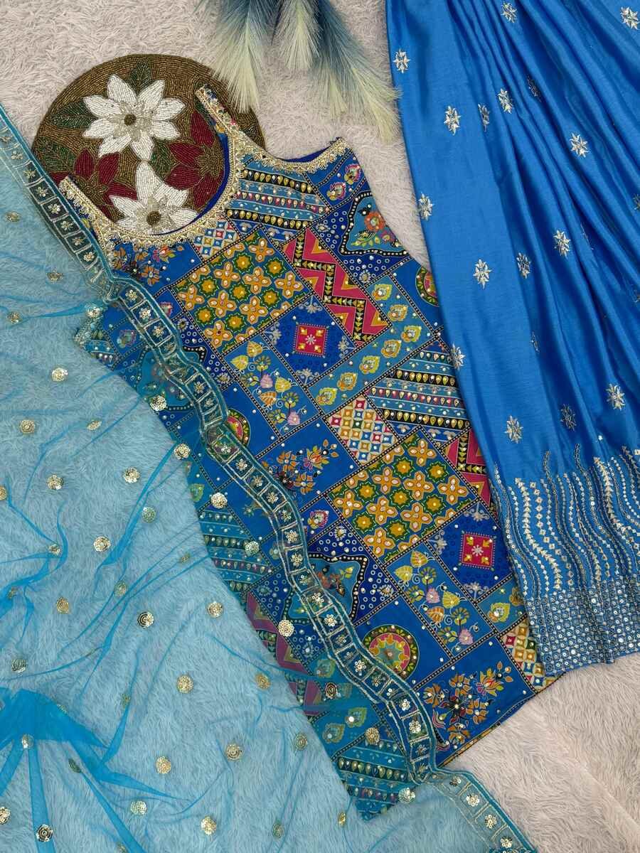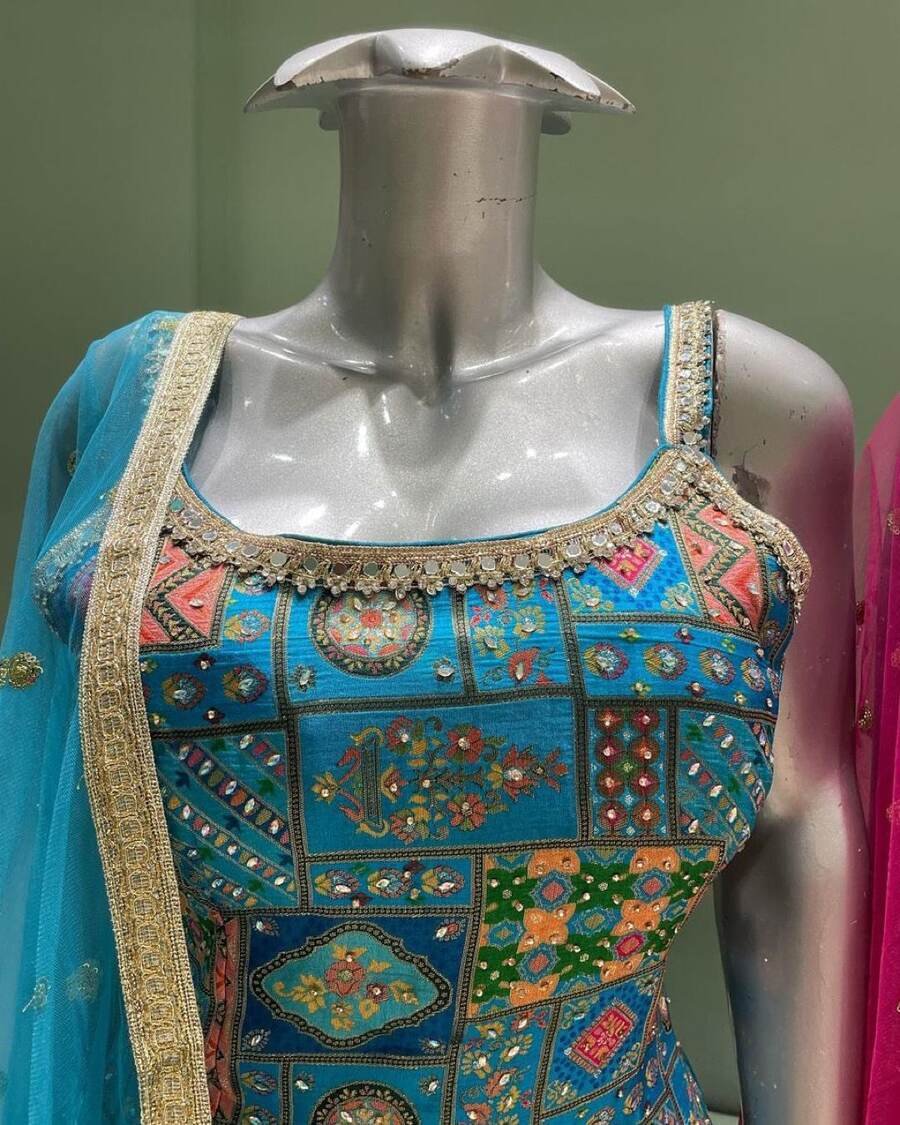 WORK : FANCY DIGITAL PRINT WITH REAL MIRROR AND STONE HAND WORK WITH NECK FANCY LACE BORDER