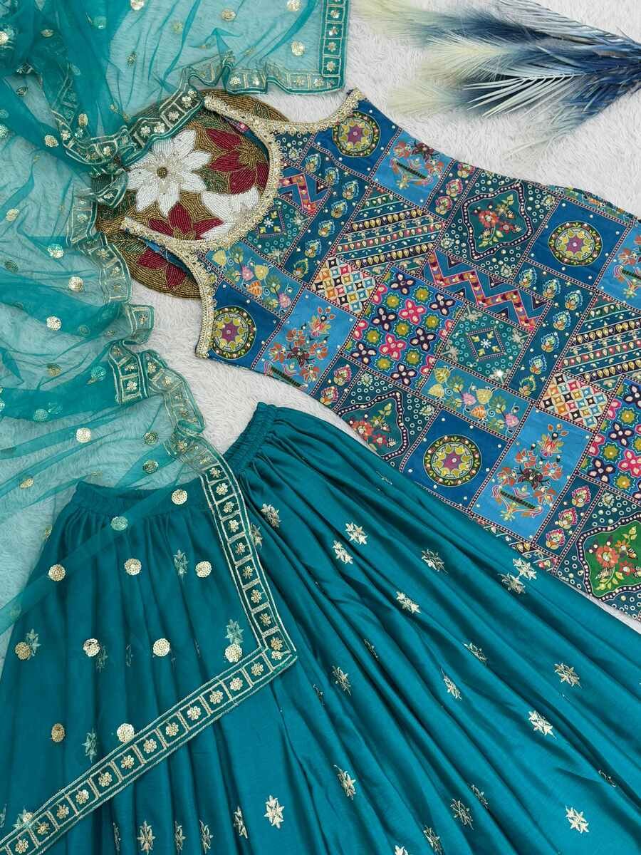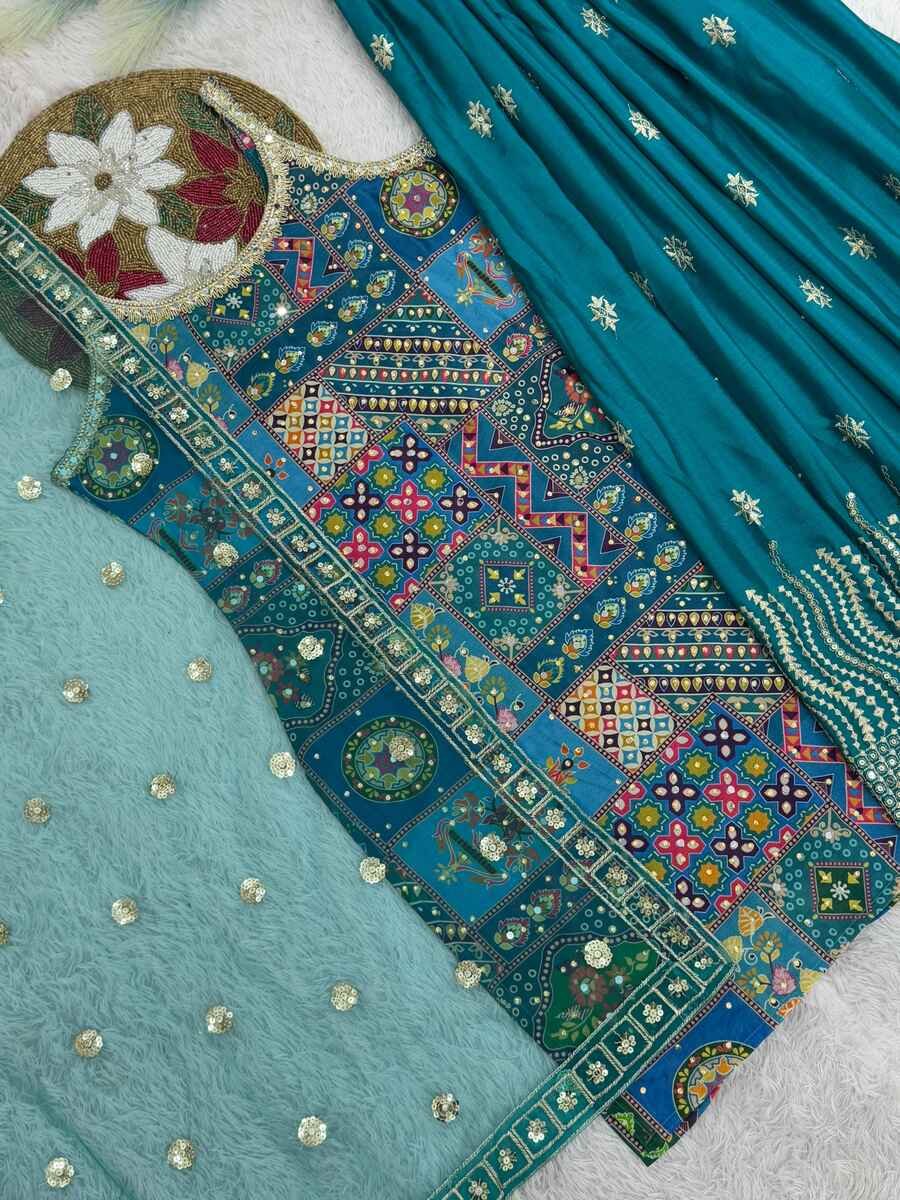 WORK : FANCY DIGITAL PRINT WITH REAL MIRROR AND STONE HAND WORK WITH NECK FANCY LACE BORDER