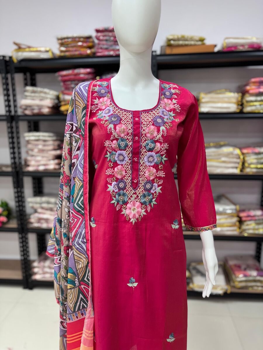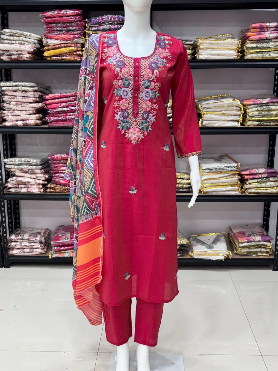 MODERN CHNADERI SILK EMBROIDERY SEQUENCE WITH BEADS HANDWORK TOP BOTTOM WITH DUPATTA RANI
