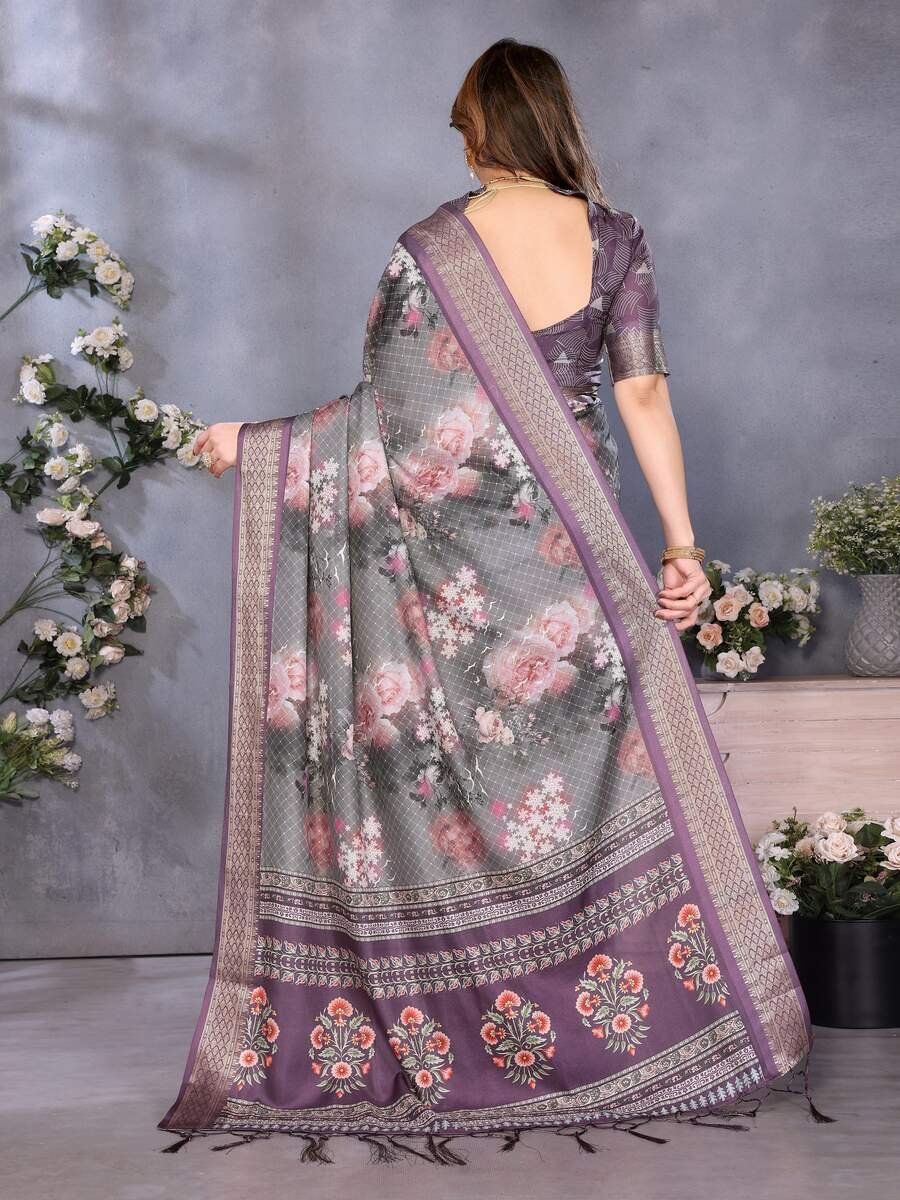 MODERN COTTON SILK DIGITAL PRINT & JACQUARD BORDER WITH FANCY TASSEL WORK SAREE WITH UNSTITCHED BLOUSE GREY