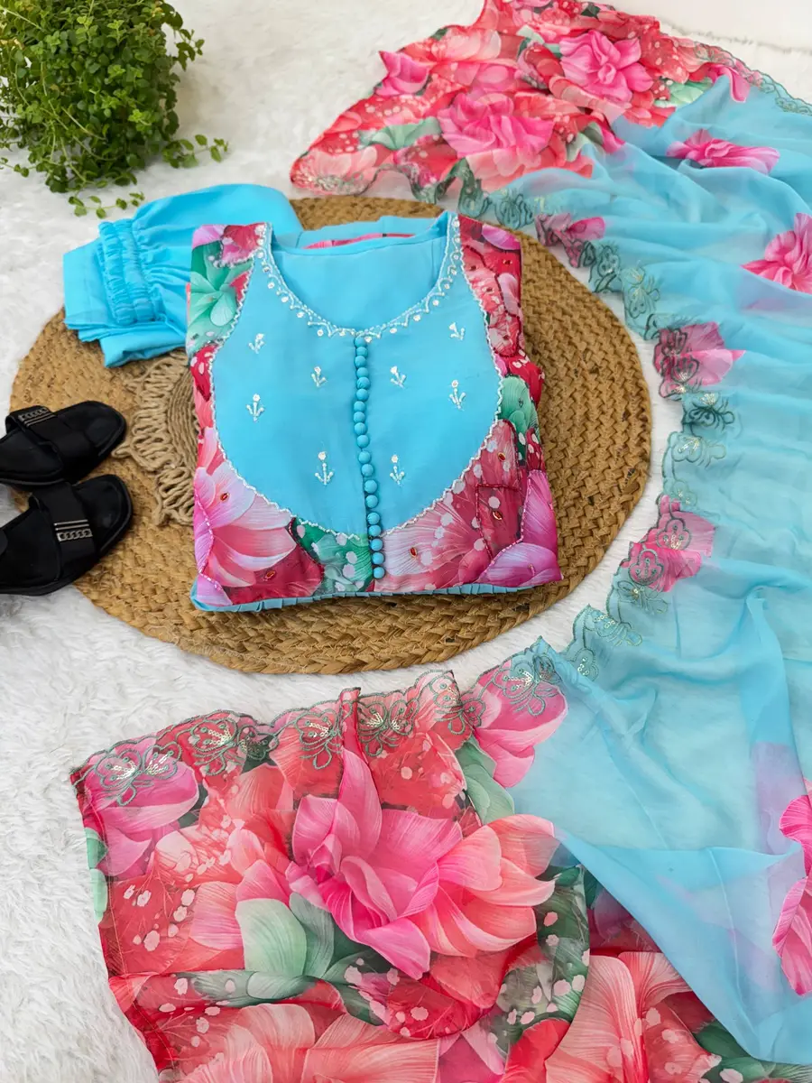 MODERN GEORGETTE DIGITAL PRINT AND HANDWORK GOWN BOTTOM WITH DUPATTA SKY