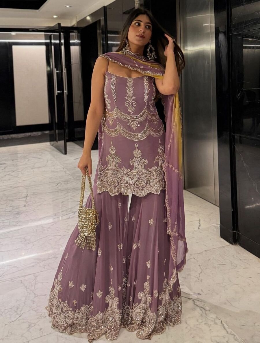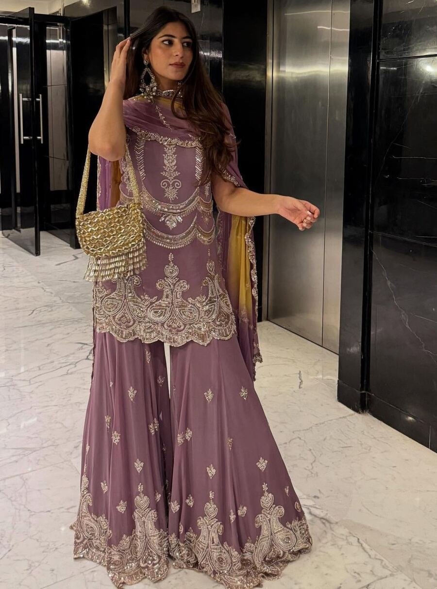 MODERN GEORGETTE EMBROIDERY SEQUENCE WORK TOP SHARARA WITH DUPATTA LAVENDER