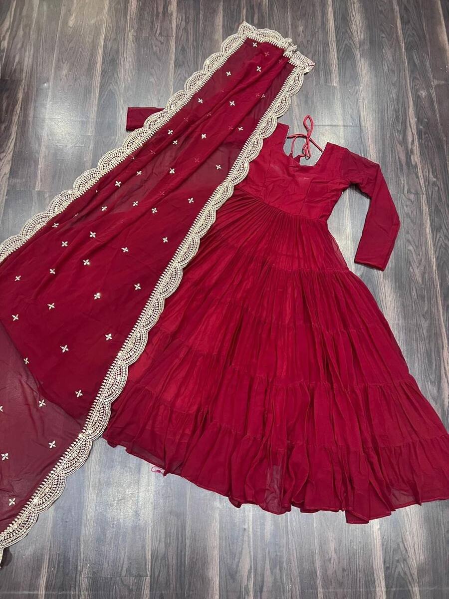 MODERN GEORGETTE PLAIN FRILL WORK GOWN WITH SEQUENCE EMBROIDERY WORK DUPATTA MAROON