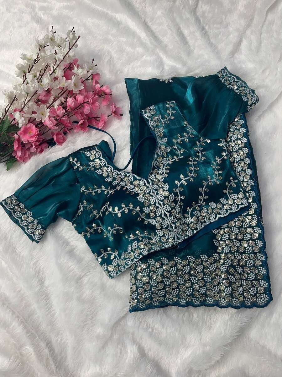 MODERN JIMMY CHOO SILK SEQUENCE WITH ARC BORDER WORK SAREE WITH STITCHED BLOUSE RAMA