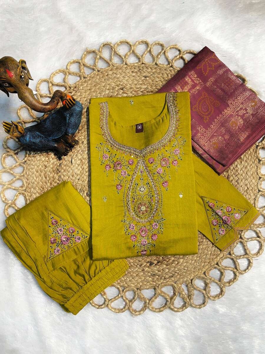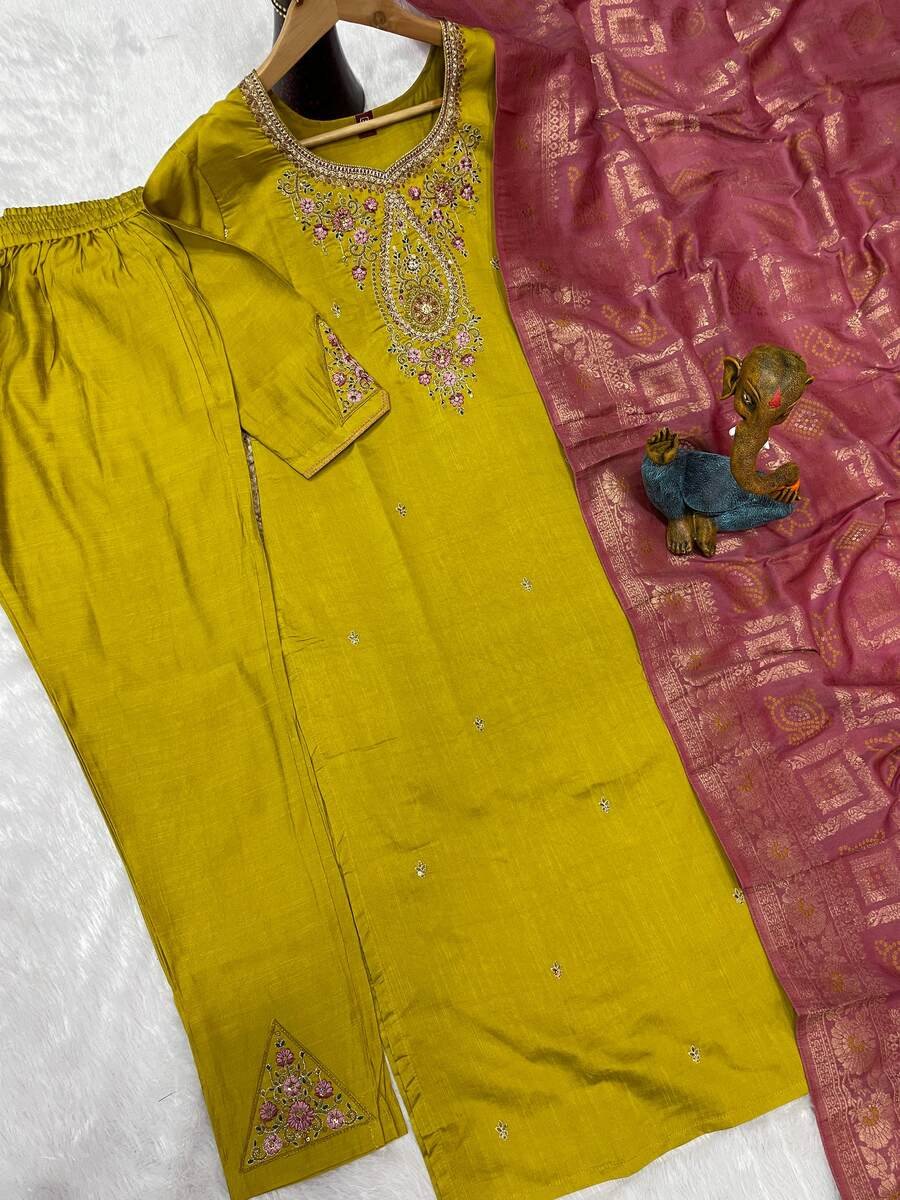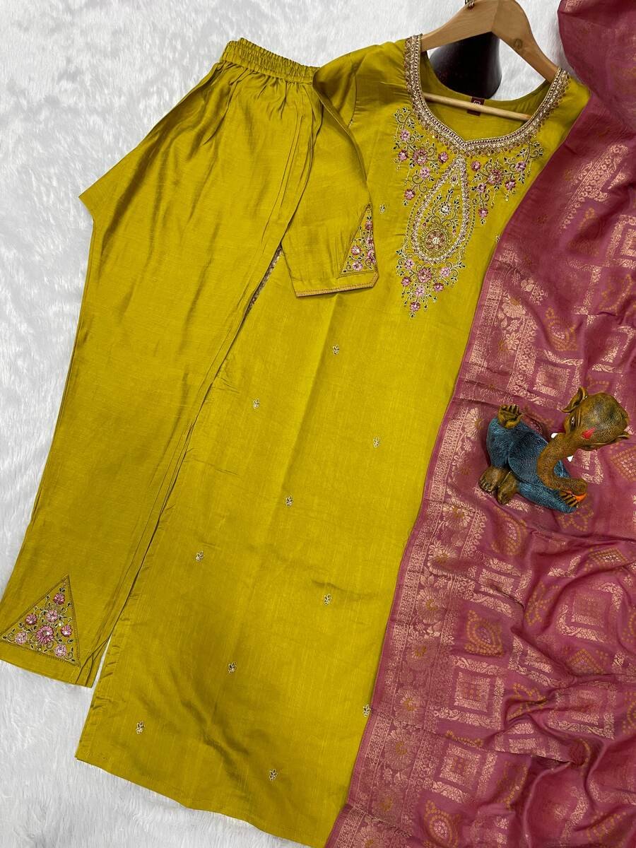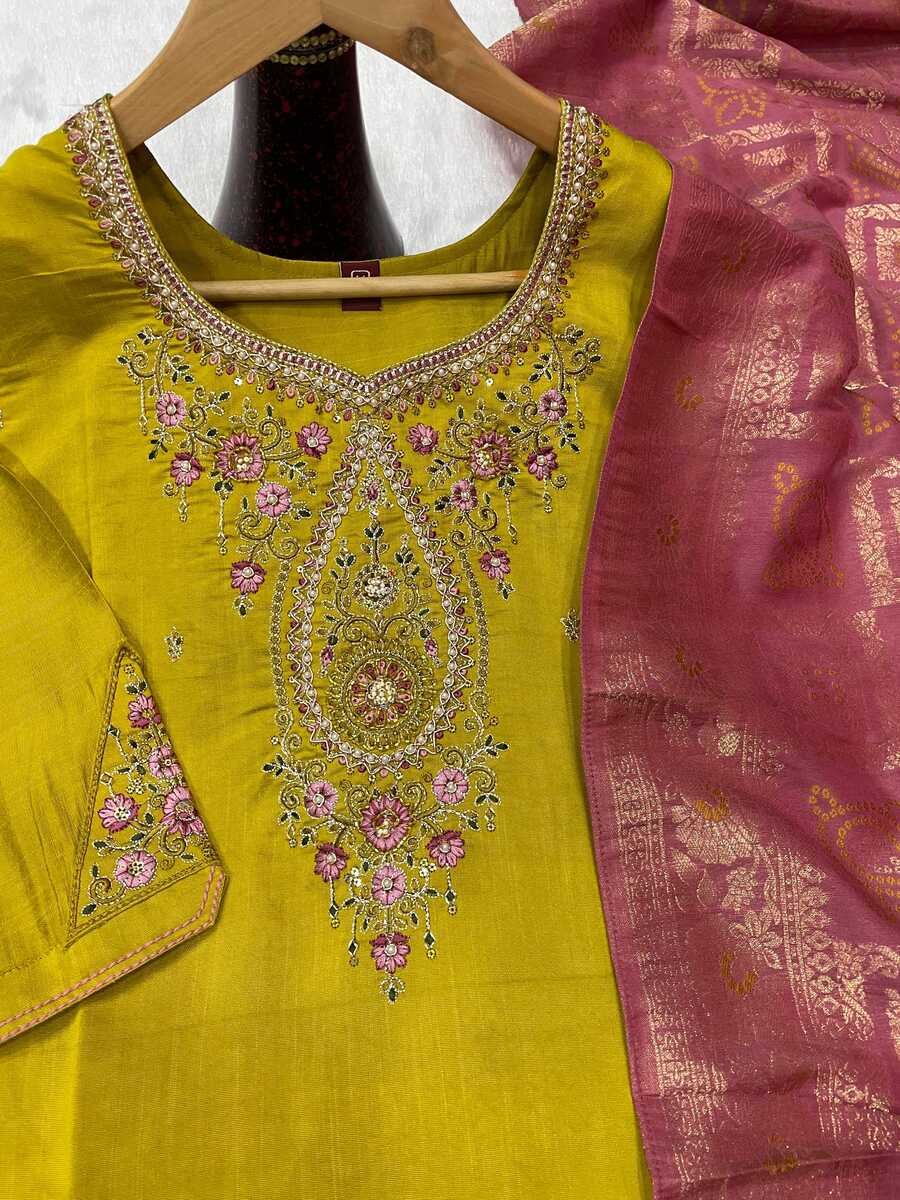 MODERN MARINA SILK MULTI EMBROIDERY THREAD, WITH HAND WORK TOP BOTTOM WITH DUPATTA YELLOW
