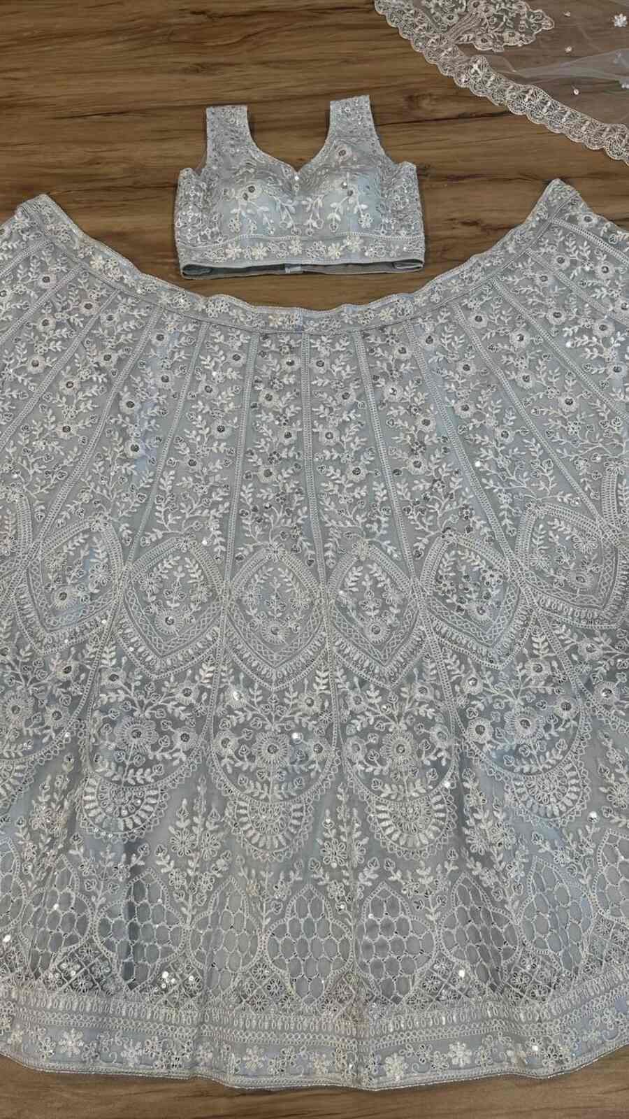 MODERN NET SEQUENCE, THREAD WORK LEHENGA CHOLI WITH DUPATTA OFF WHITE