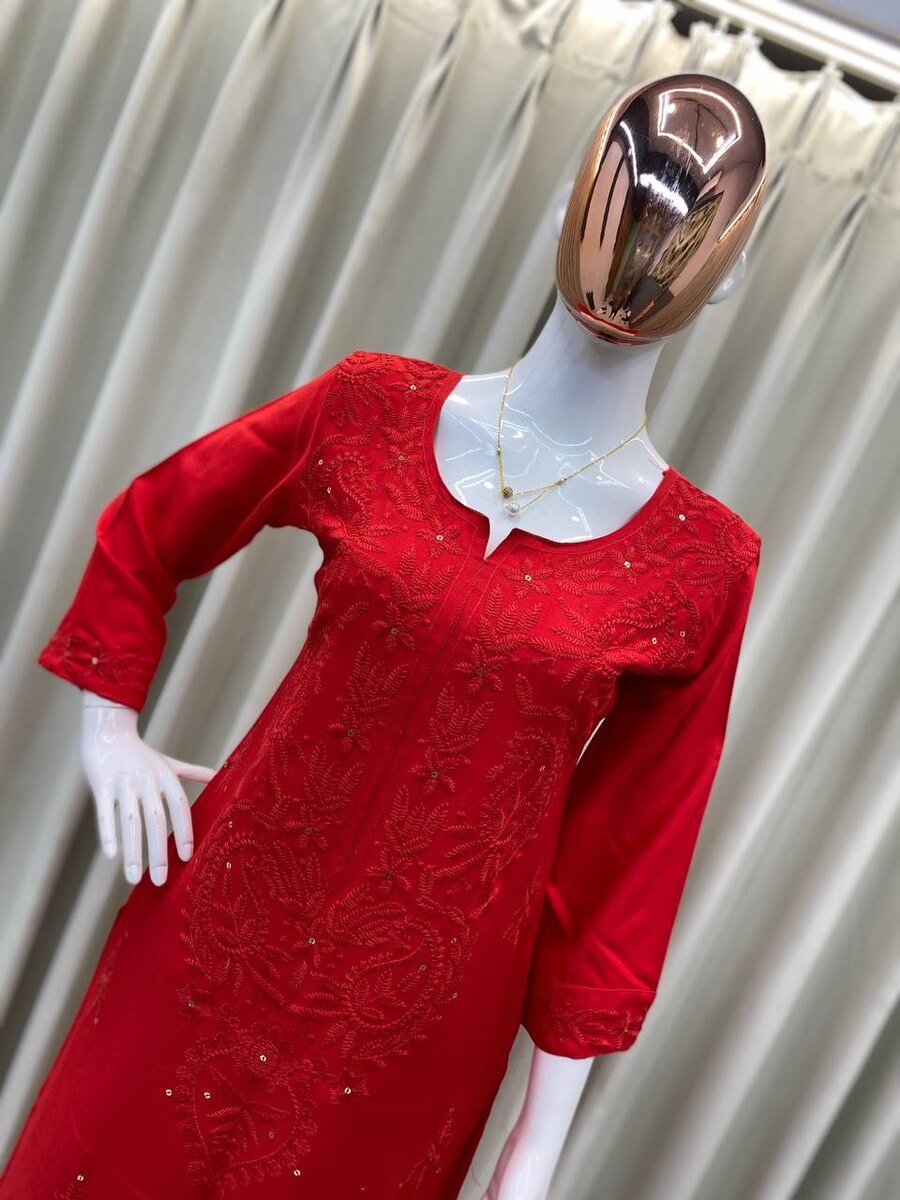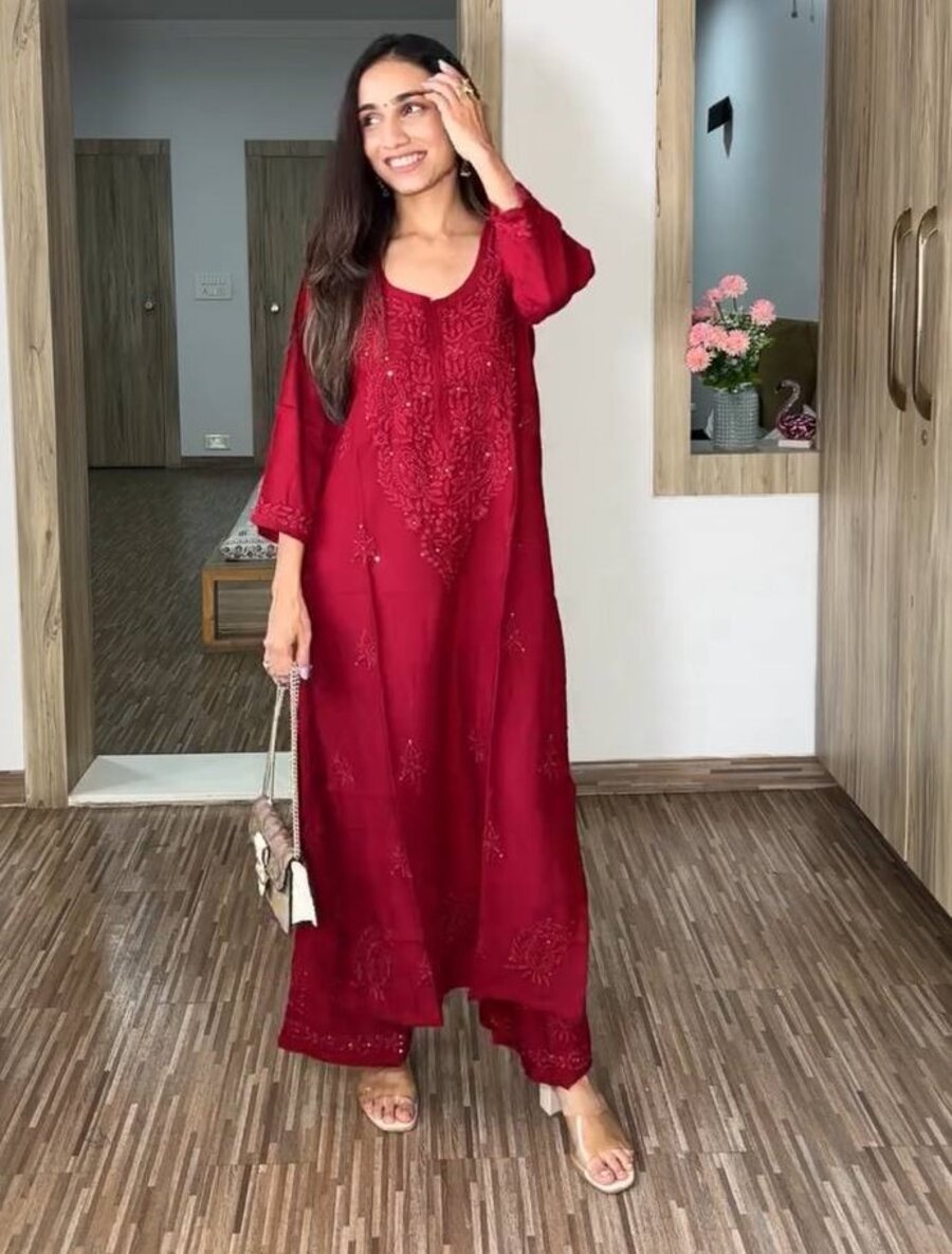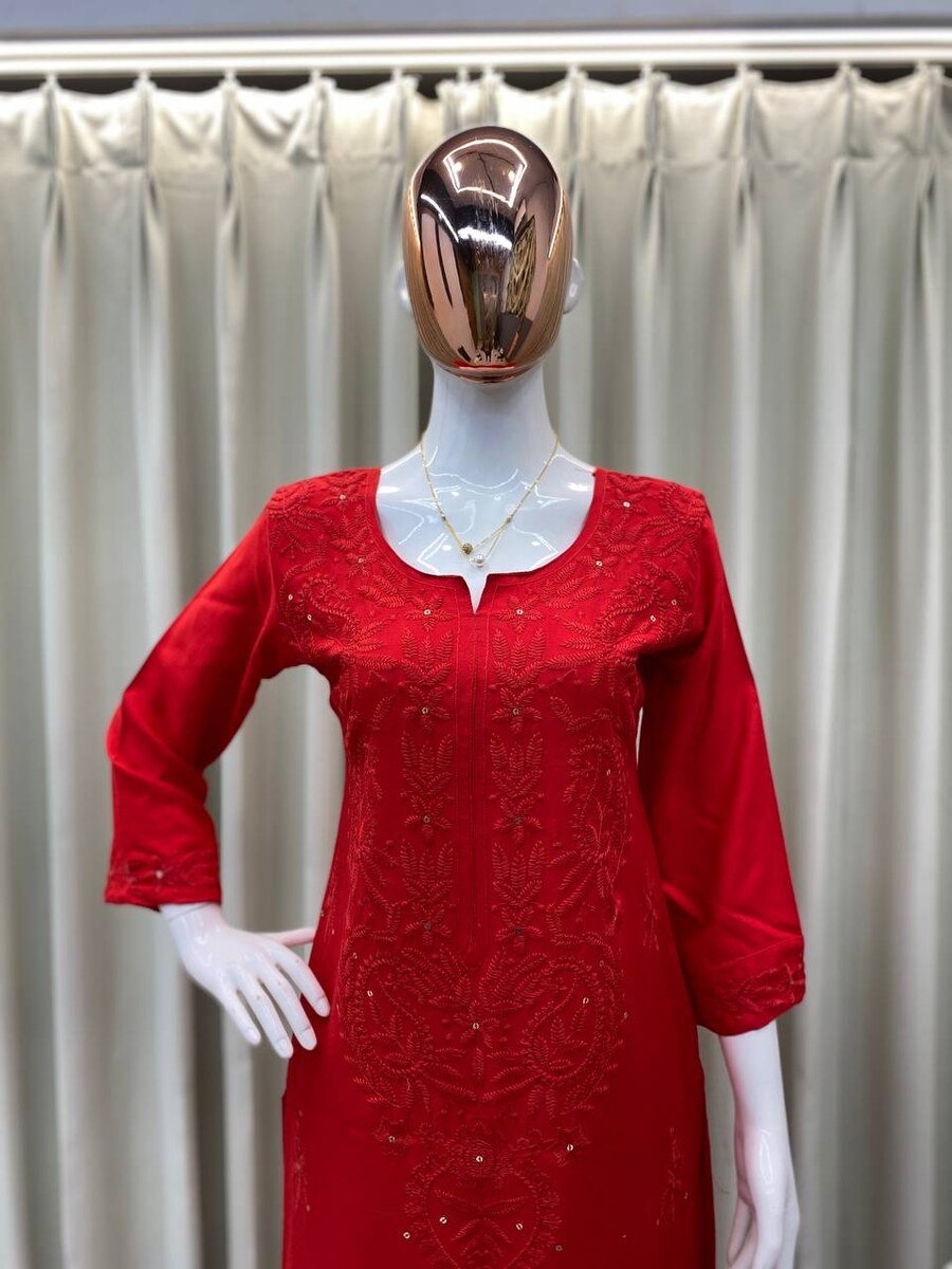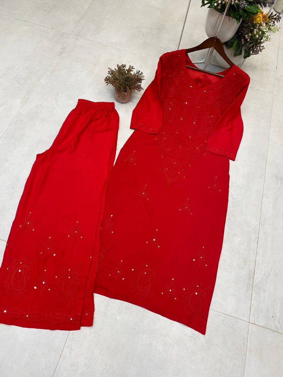 MODERN RAYON SEQUENCE EMBROIDERY WORK KURTI PALAZZO SET RED