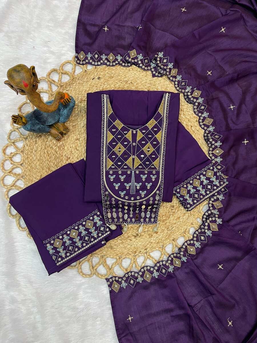MODERN ROMAN SILK MULTI EMBROIDERY THREAD WITH REAL MIRROR HAND WORK TOP BOTTOM WITH DUPATTA PURPLE
