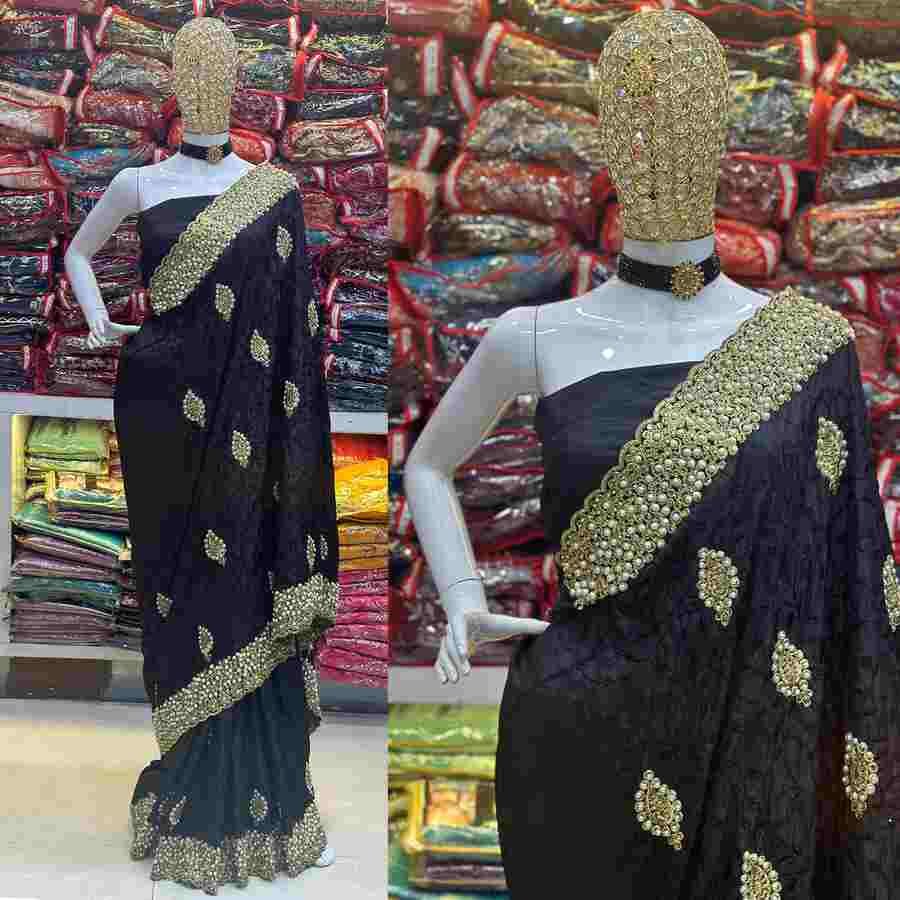 MODERN SANA SILK EMBROIDERY WITH PEARL DIAMOND WORK SAREE WITH UNSTITCHED BLOUSE BLACK
