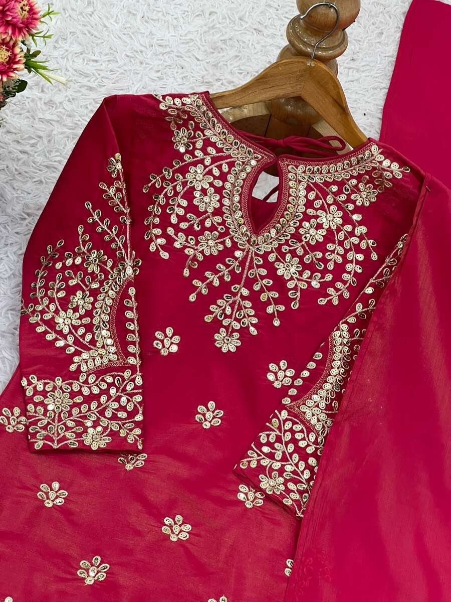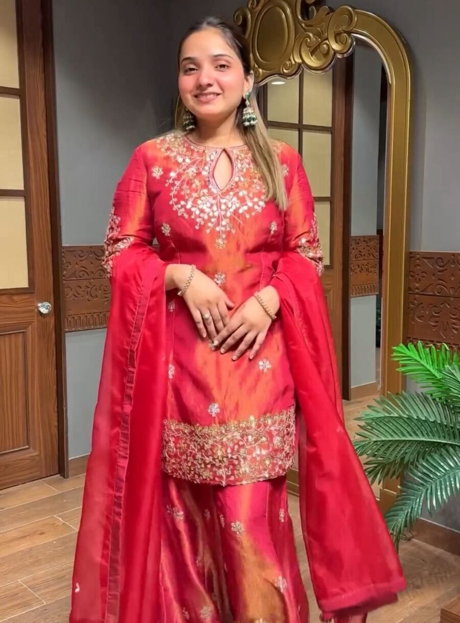MODERN SHIMMER SILK EMBROIDERY WORK TOP PALAZZO WITH DUPATTA RED