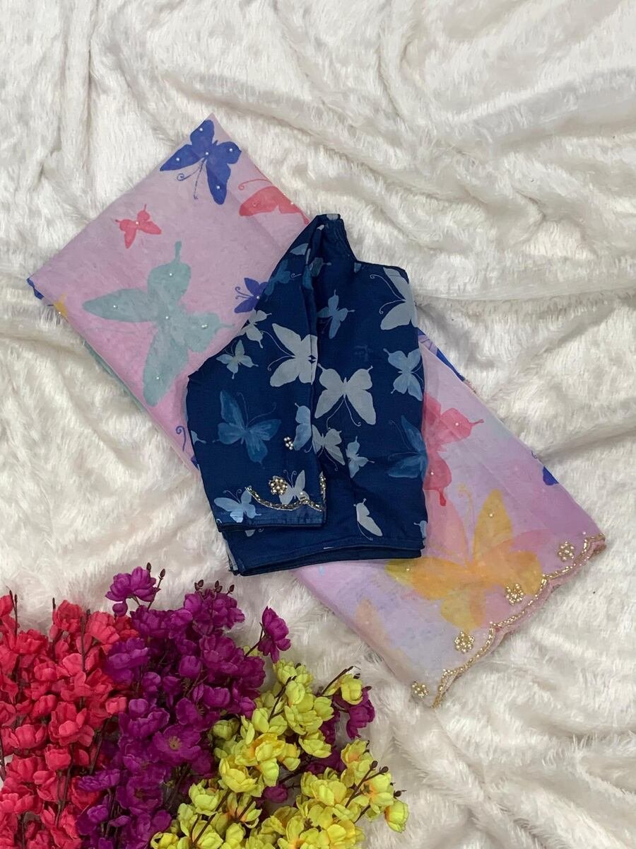 MODERN TABBY SILK HANDWORK AND CUTWORK WITH PEARL SAREE WITH UNSTITCHED BLOUSE PINK