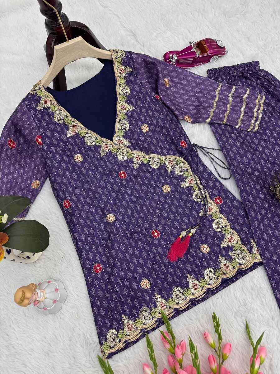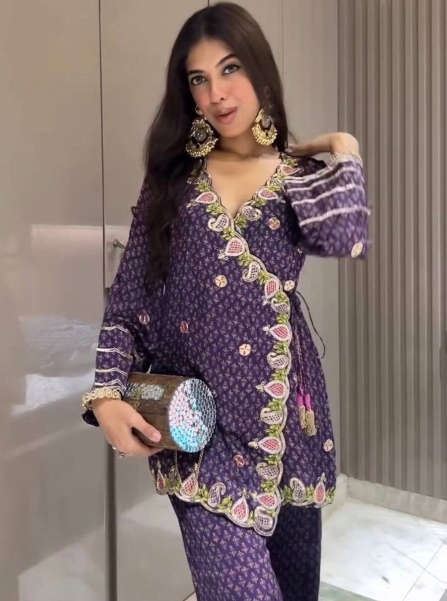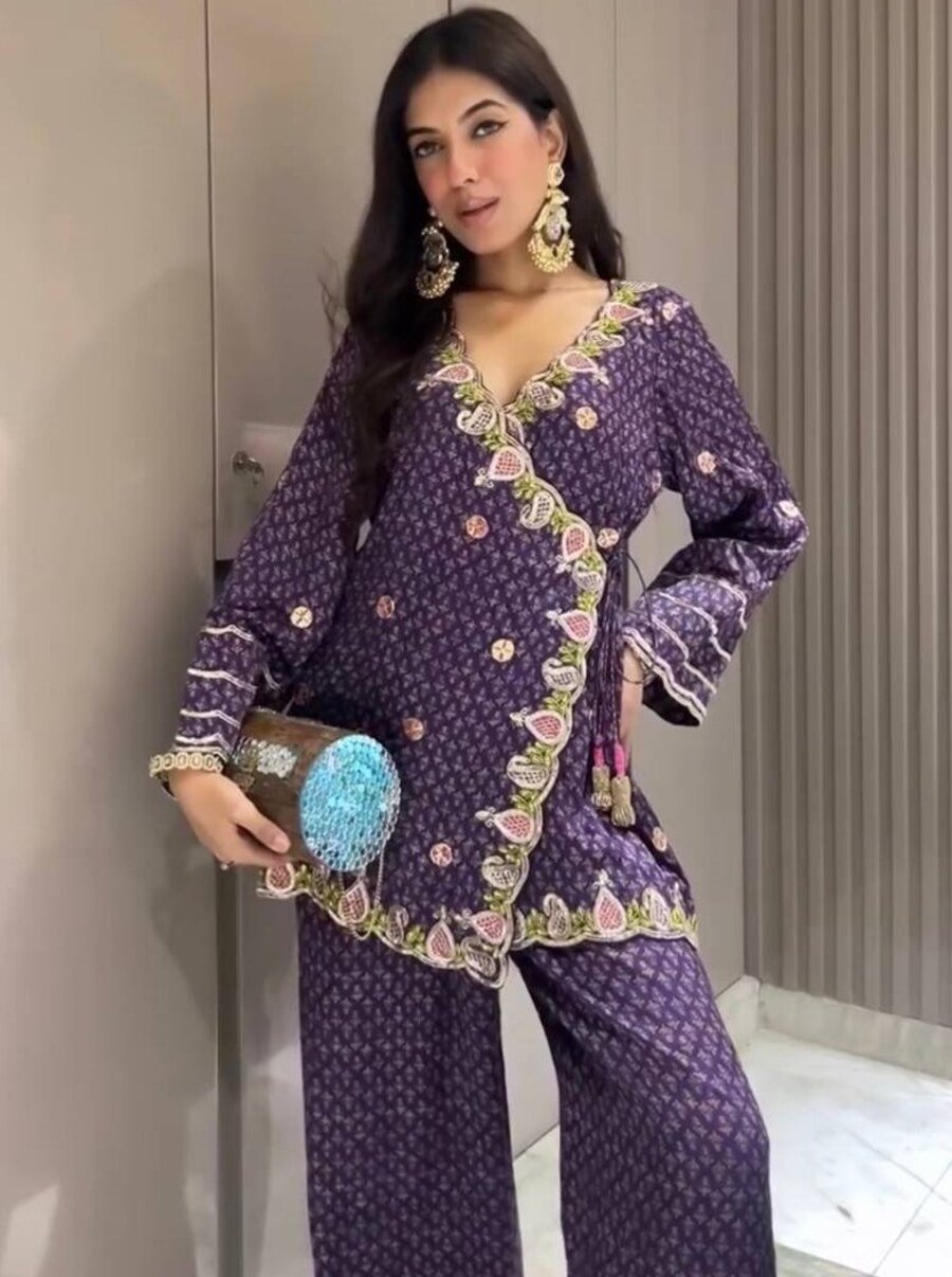 MODERN VICHITRA SILK DIGITAL PRINT WITH EMBROIDERY THREADS ,SEQUENCE & CODING WORK TOP PALAZZO SET PURPLE