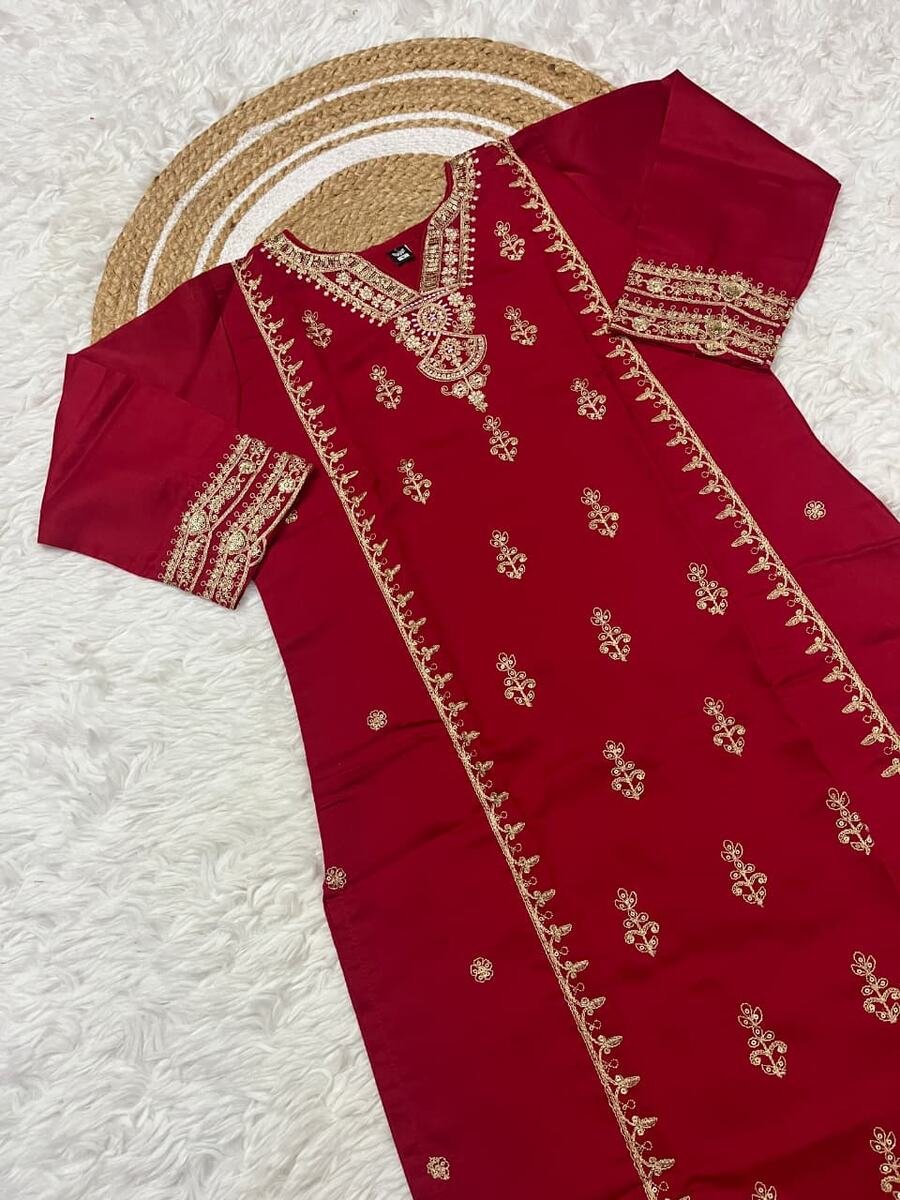 MODERN VISCOSE CHANDERI SEQUENCE CODING EMBROIDERY WORK TOP BOTTOM WITH DUPATTA RED