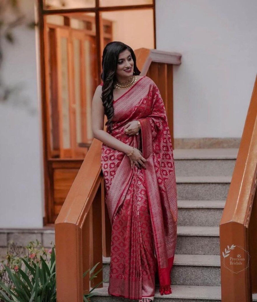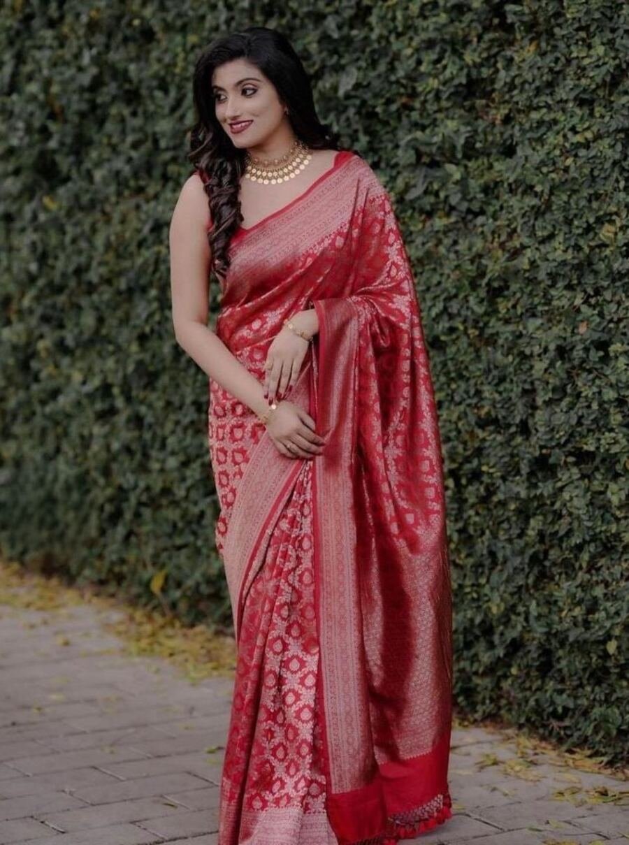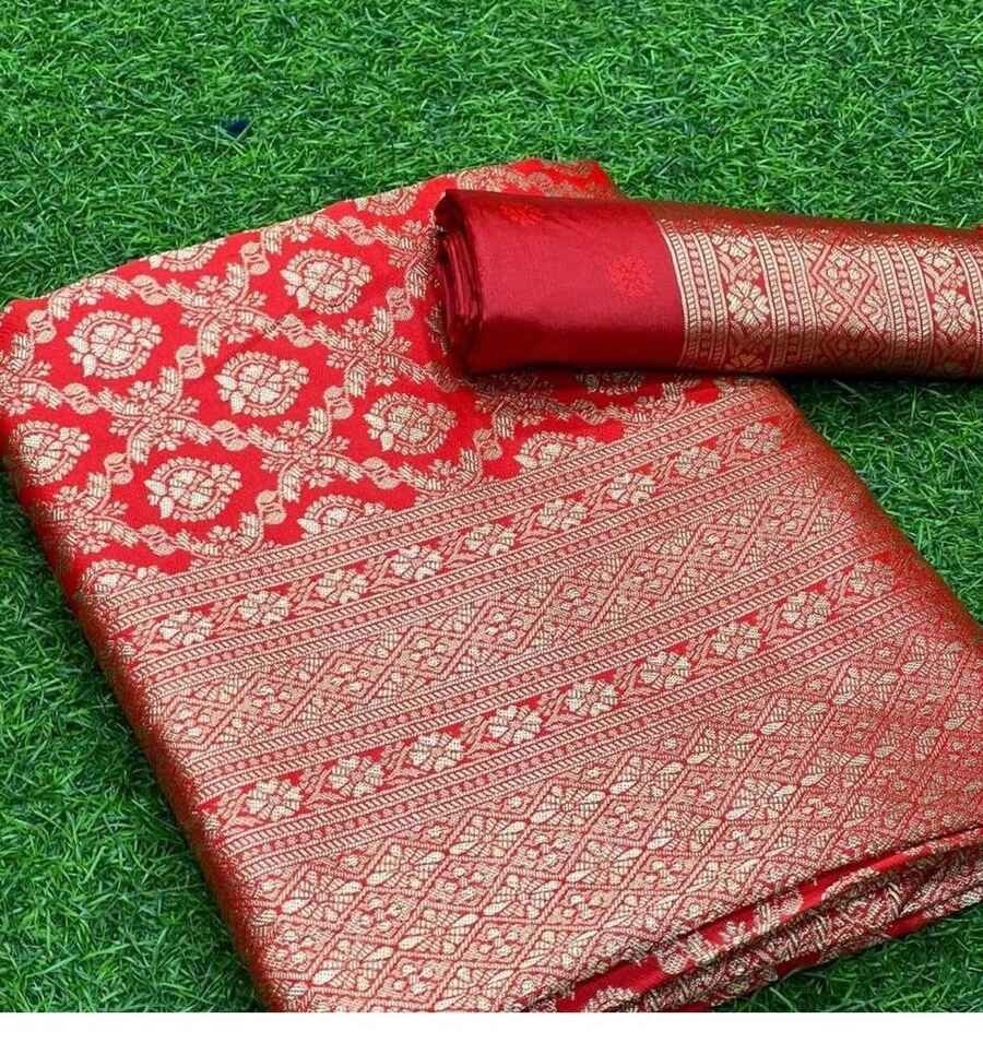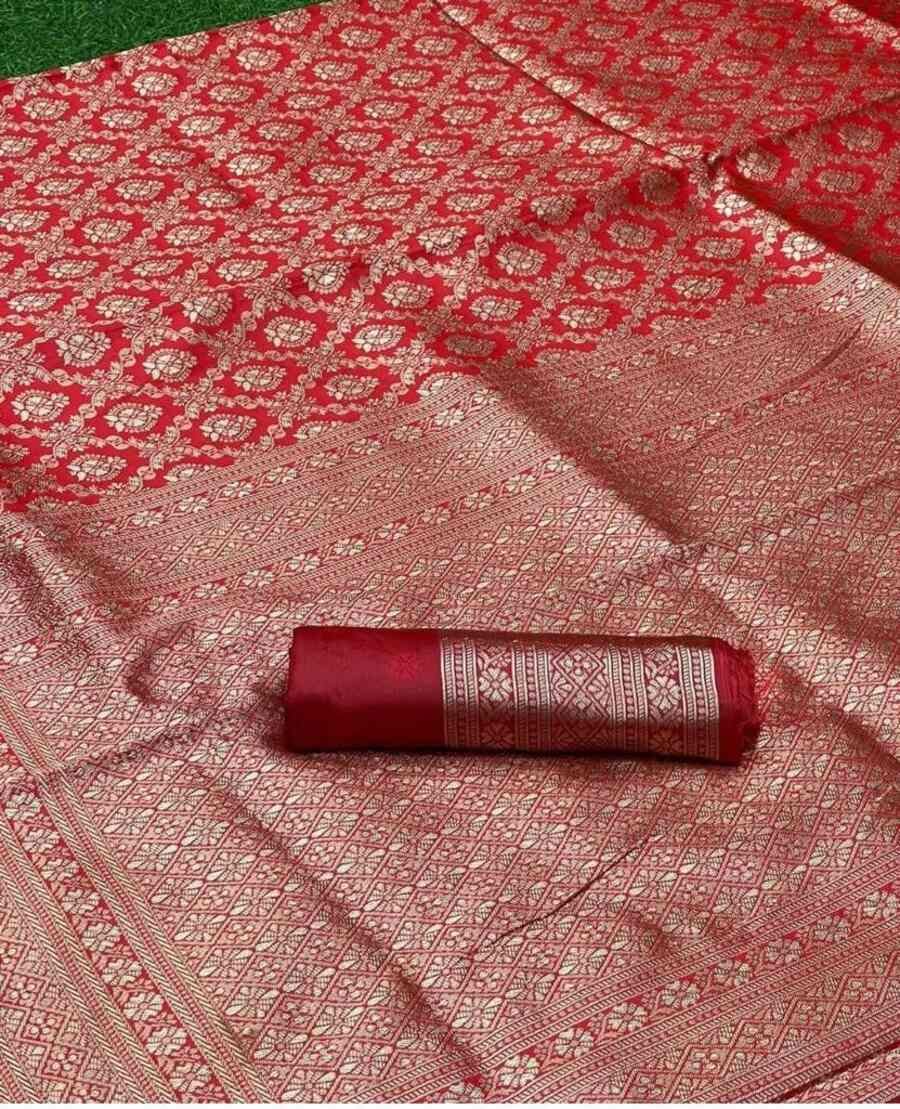 MOST PICKED BANARASI SOFT SILK ZARI WEAVING WORK SAREE WITH UNSTITCHED BLOUSE RED