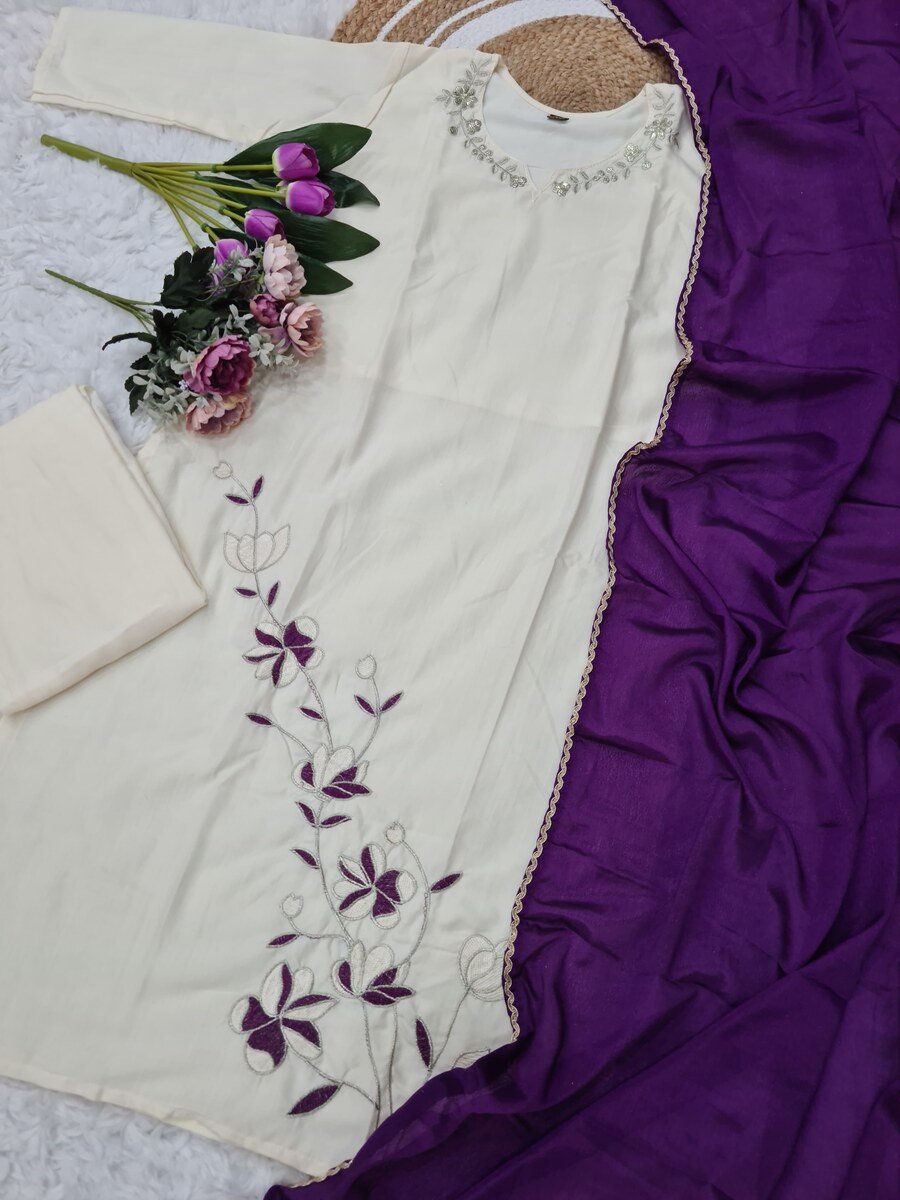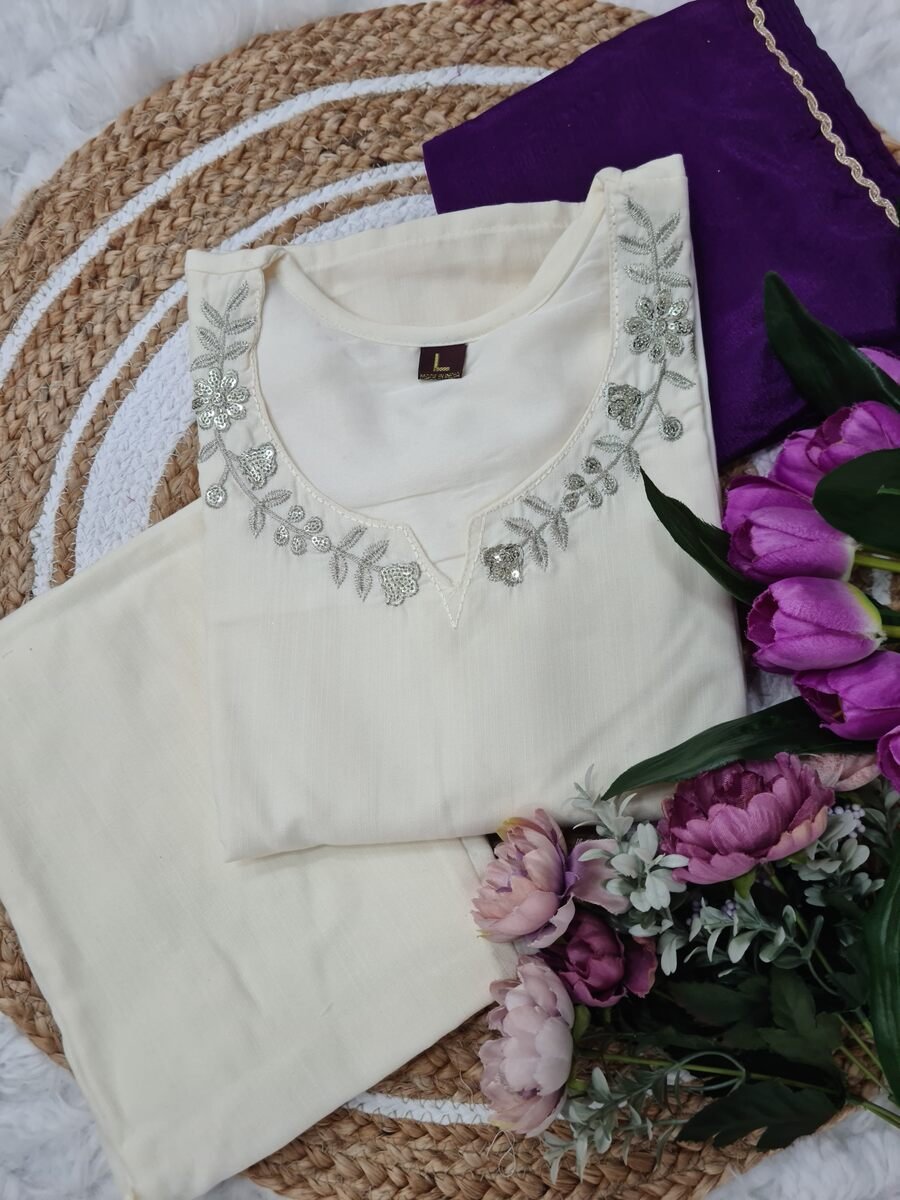 MOST PICKED VISCOSE RAYON EMBROIDERY SEQUENCE WORK TOP BOTTOM WITH DUPATTA WHITE