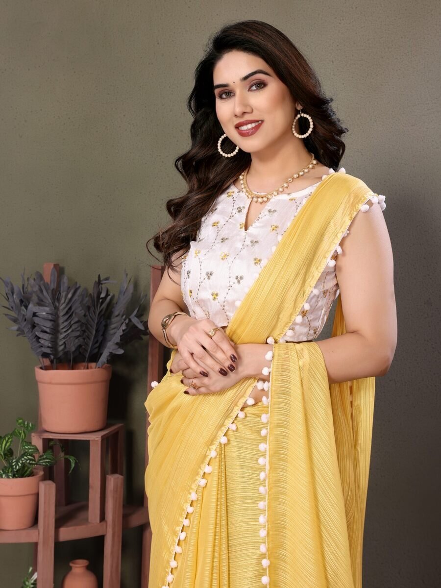 MOST TRENDING SATIN POLYESTER ZARI PLAIN SAREE WITH EMBROIDERY WORK UNSTITCHED BLOUSE YELLOW