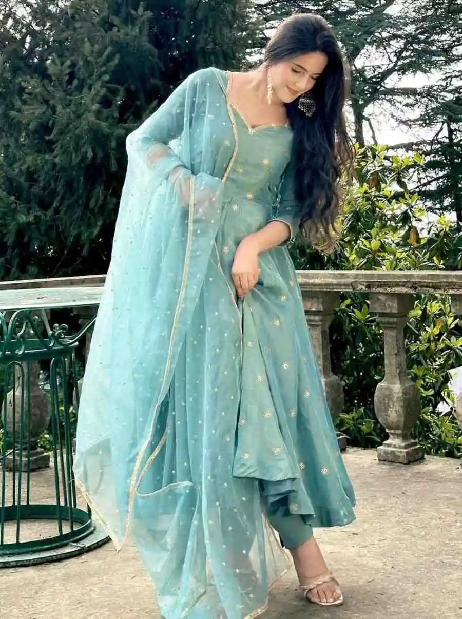 NEW ARRIVAL BURBERRY SILK EMBROIDERY WORK ANARKALI WITH DUPATTA SKY