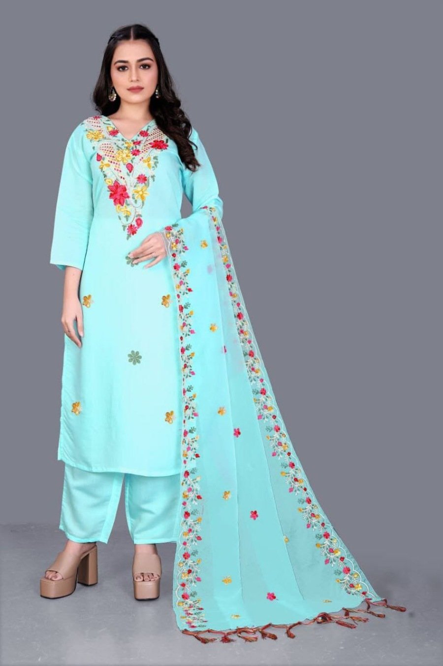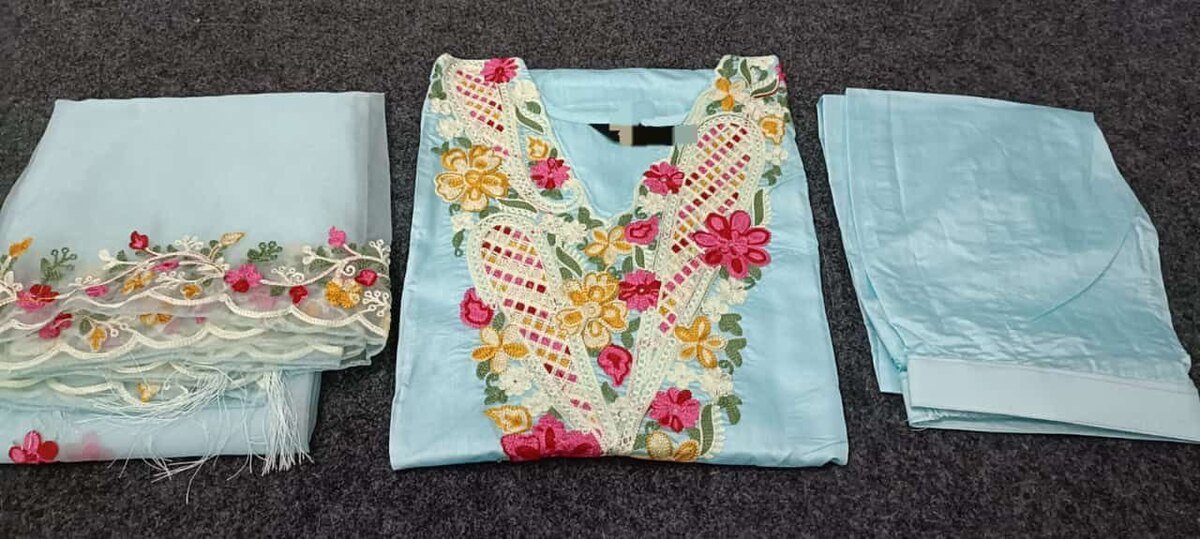 NEW ARRIVAL CHANDERI COTTON EMBROIDERY WORK TOP BOTTOM WITH DUPATTA SKY