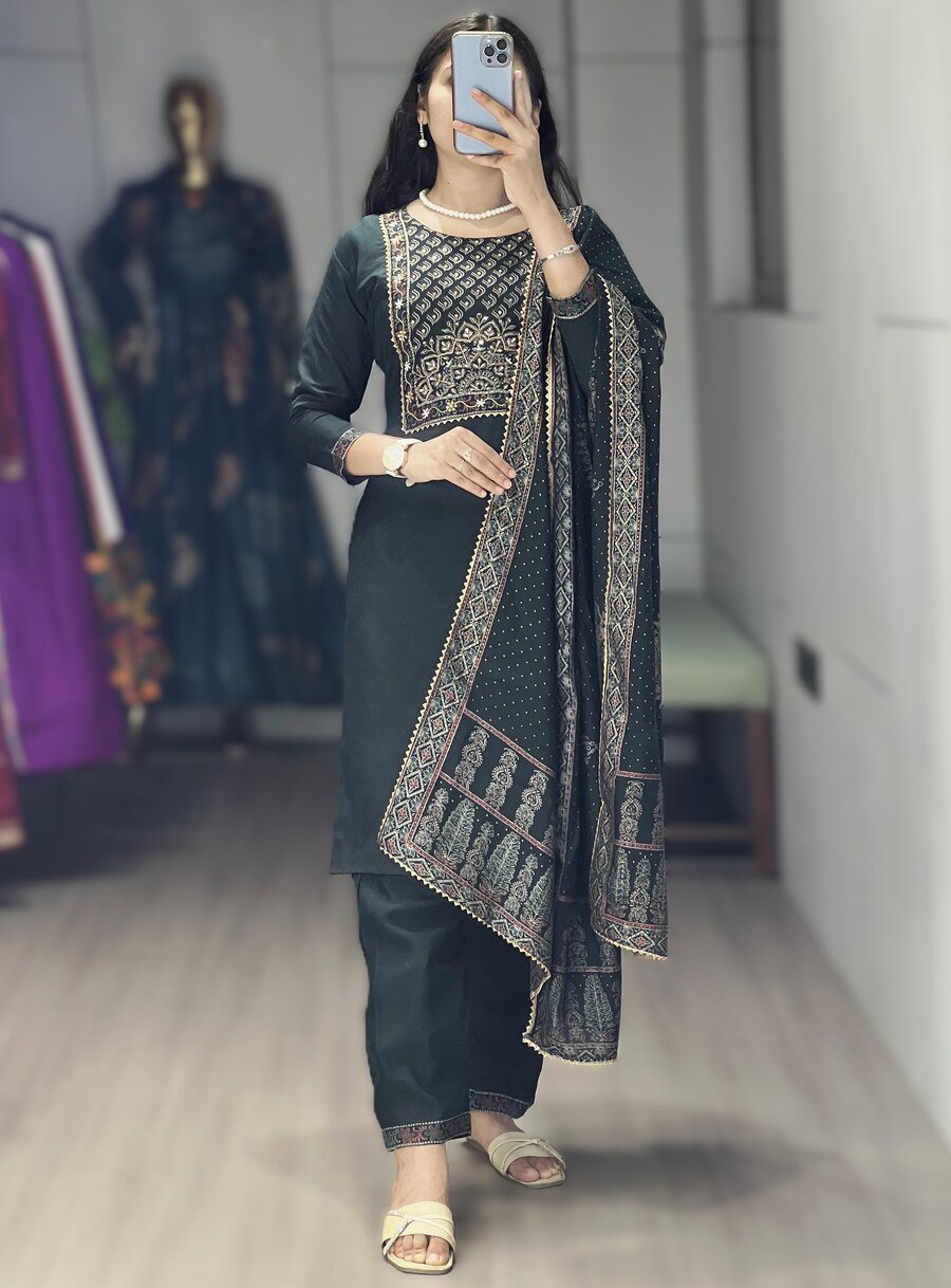 NEW ARRIVAL CHANDERI PRINT WITH FOIL WORK AND HANDWORK TOP BOTTOM WITH DUPATTA GREEN