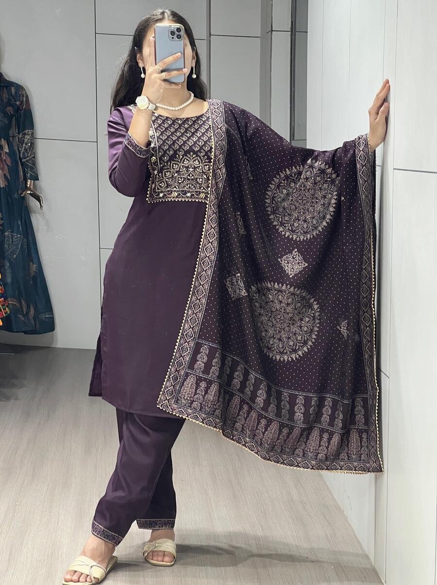 NEW ARRIVAL CHANDERI PRINT WITH FOIL WORK AND HANDWORK TOP BOTTOM WITH DUPATTA PURPLE
