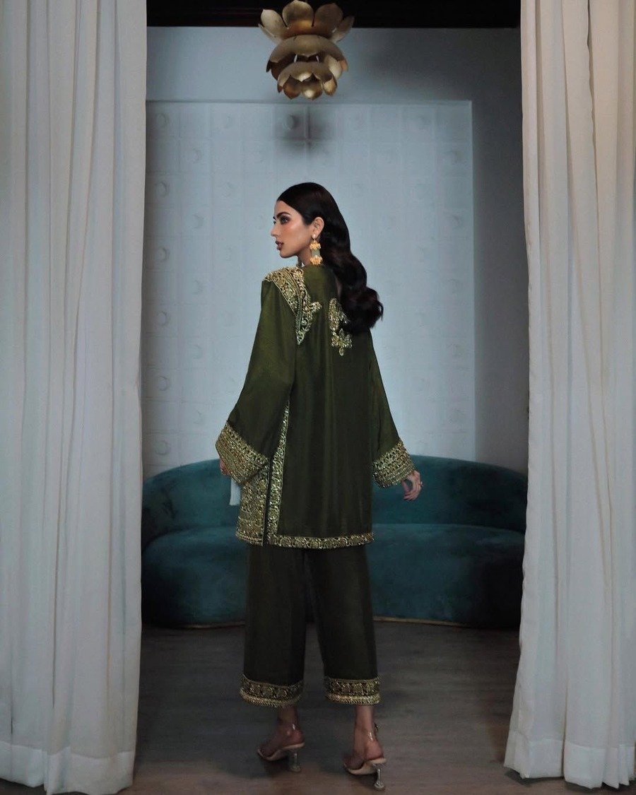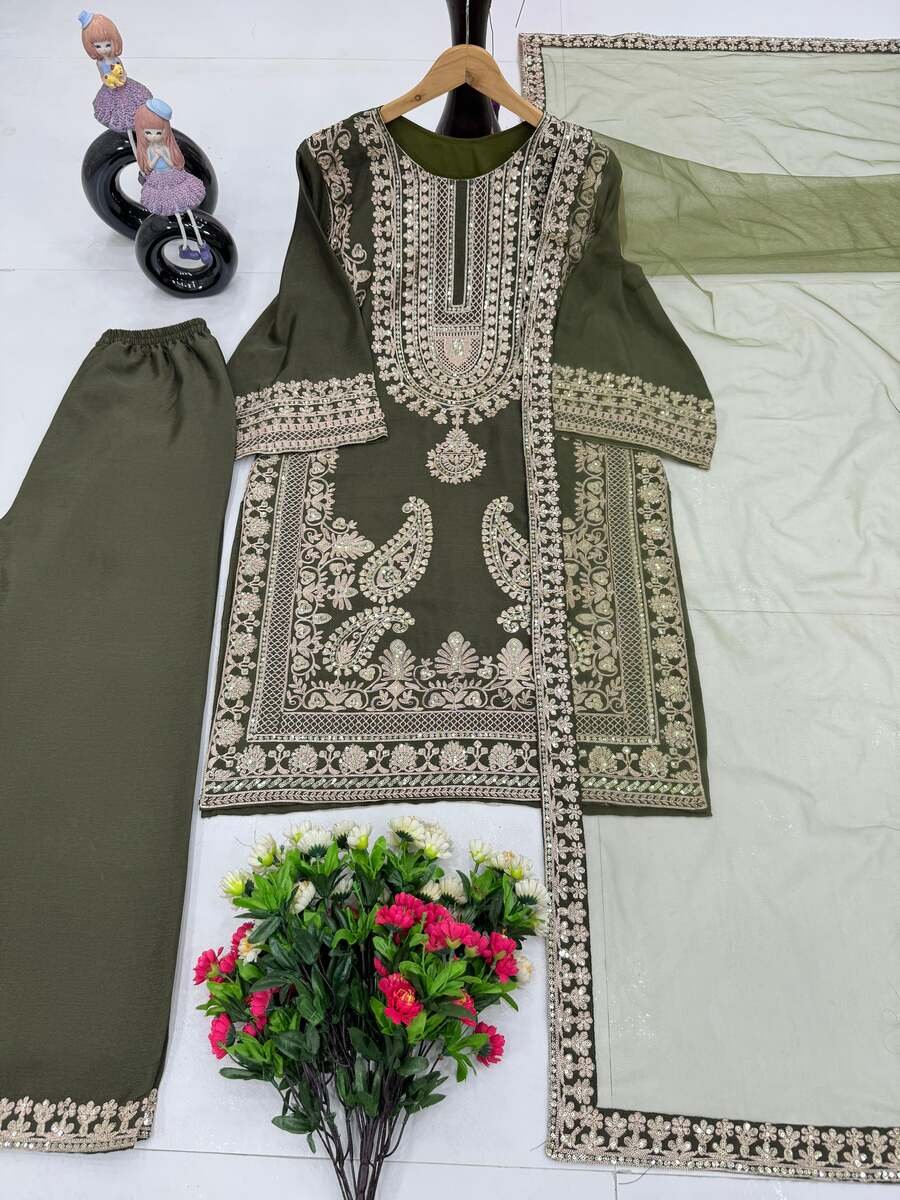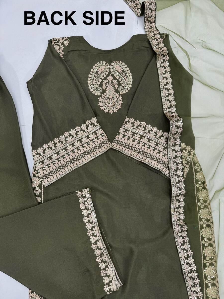 NEW ARRIVAL CHINON EMBROIDERY SEQUENCE WORK TOP BOTTOM WITH DUPATTA MEHNDI