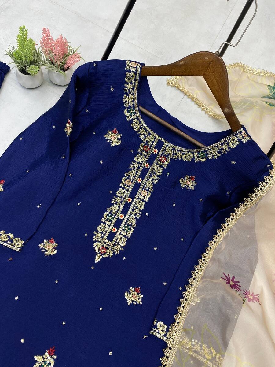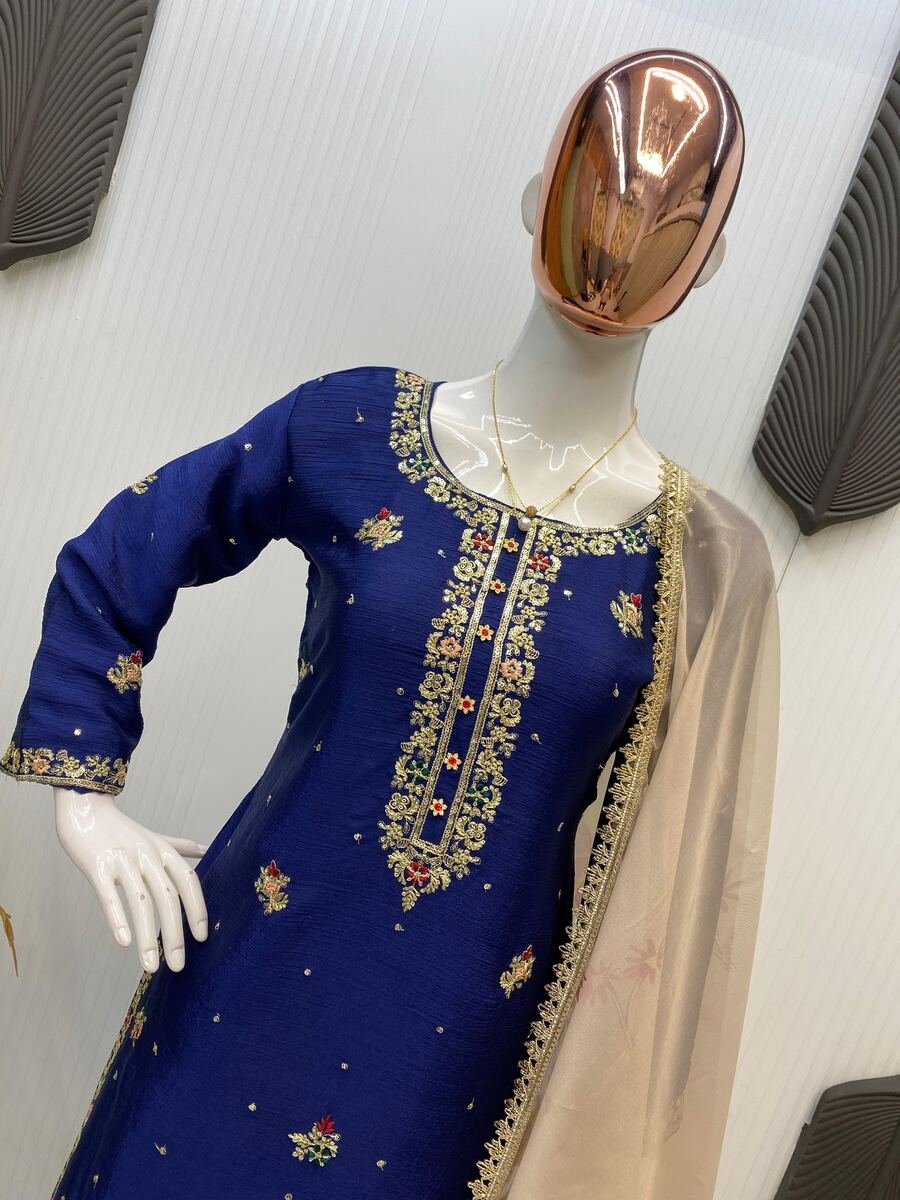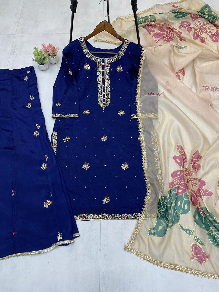 NEW ARRIVAL CHINON SEQUENCE EMBROIDERY WORK TOP PALAZZO WITH DUPATTA BLUE