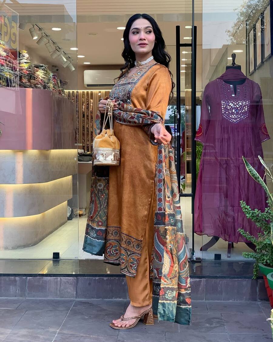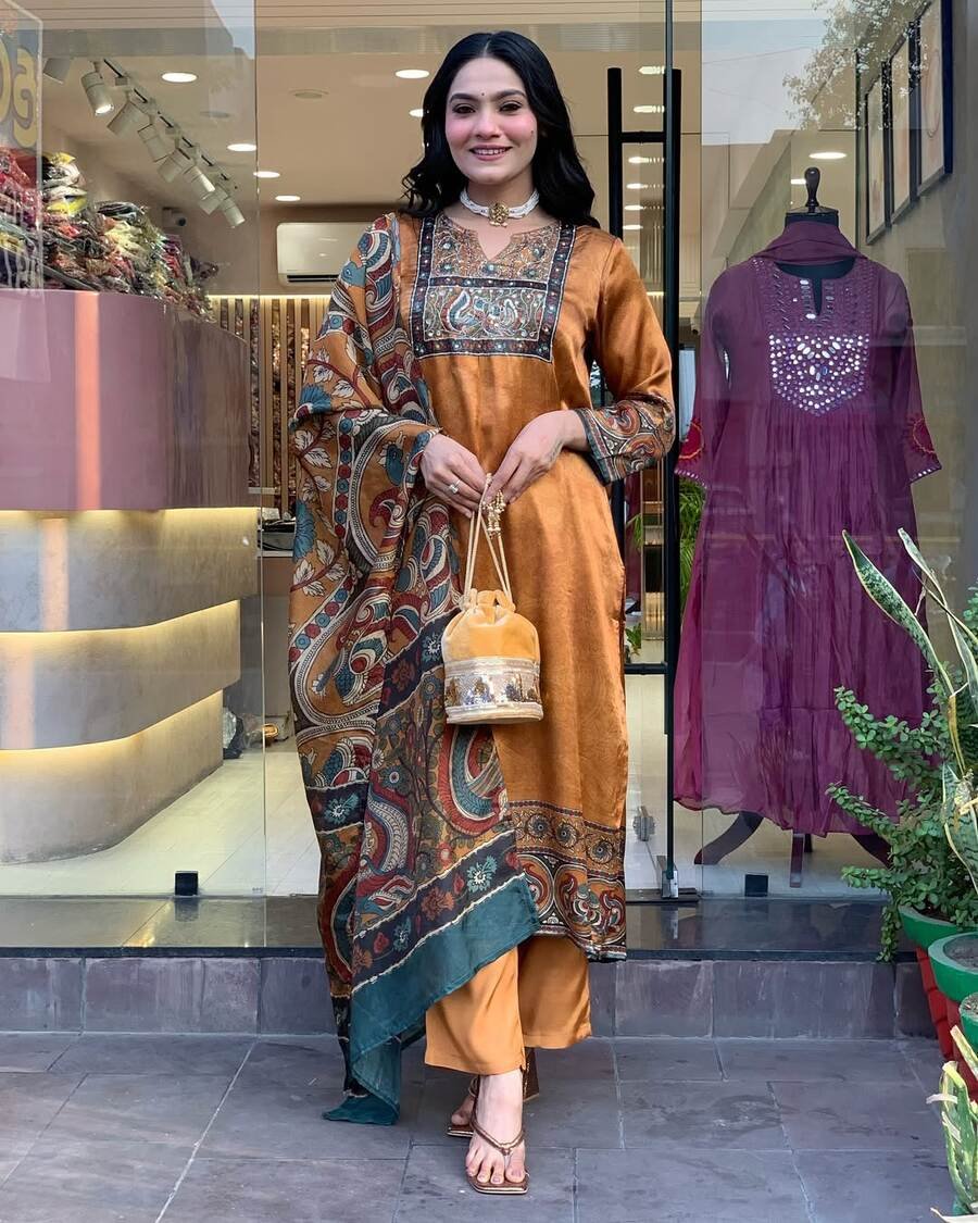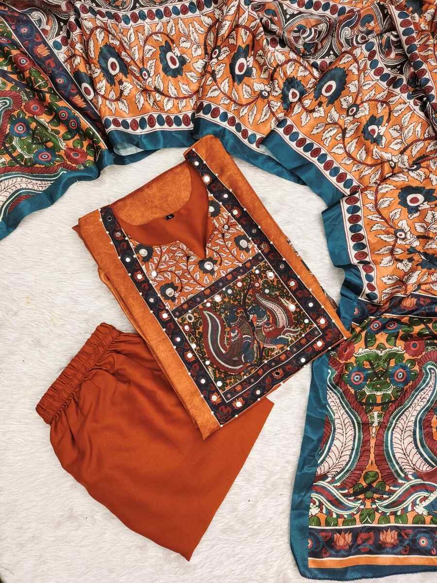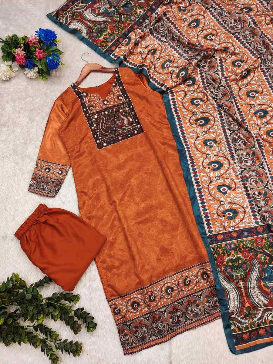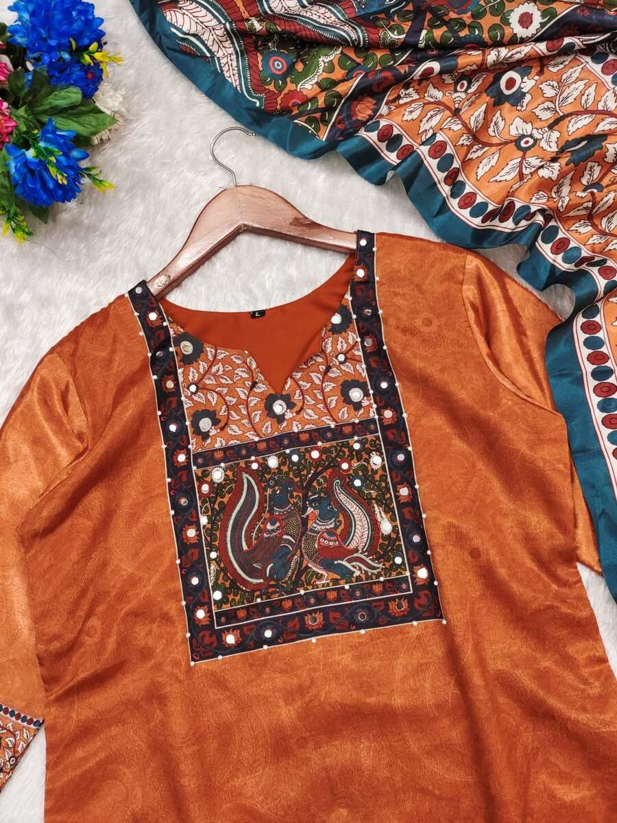 NEW ARRIVAL CHINON SILK DIGITAL PRINT WITH REAL MIRROR AND DIAMOND HANDWORK TOP BOTTOM WITH DUPATTA ORANGE