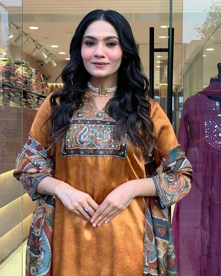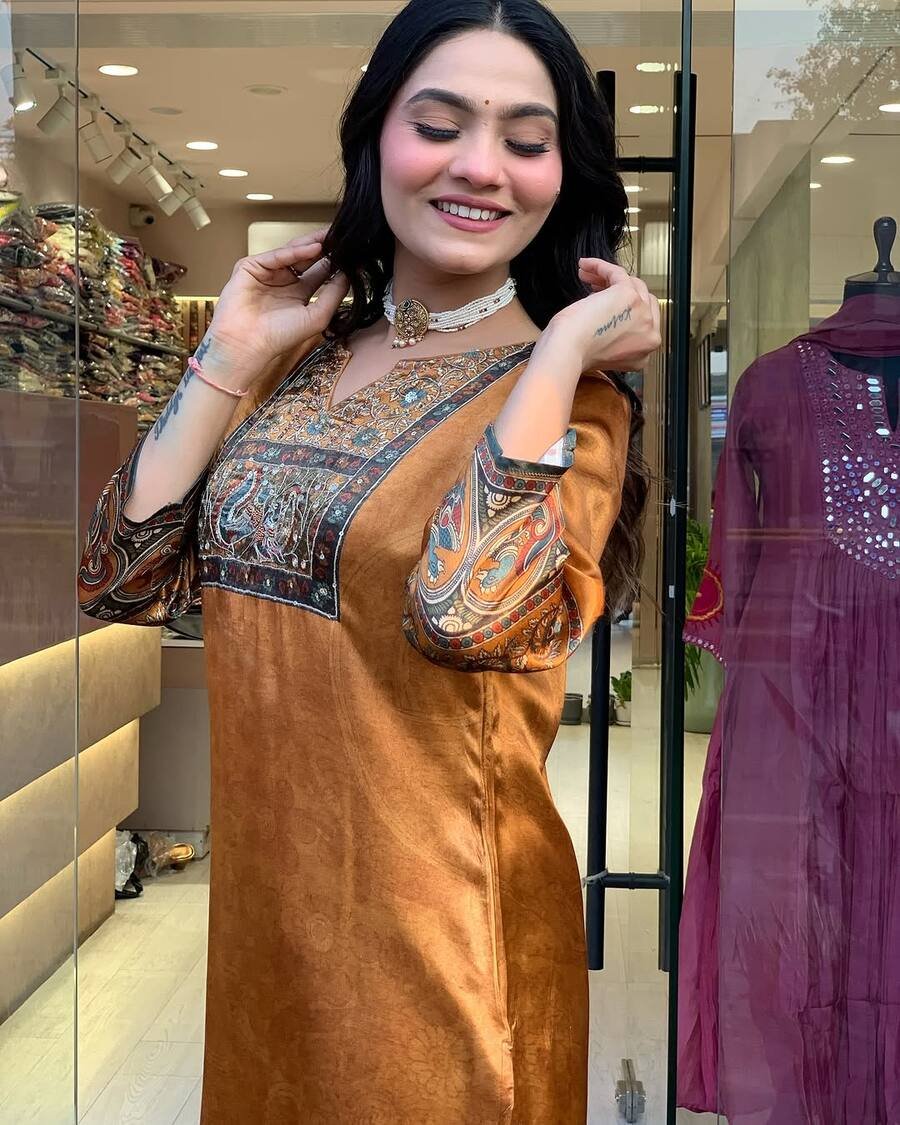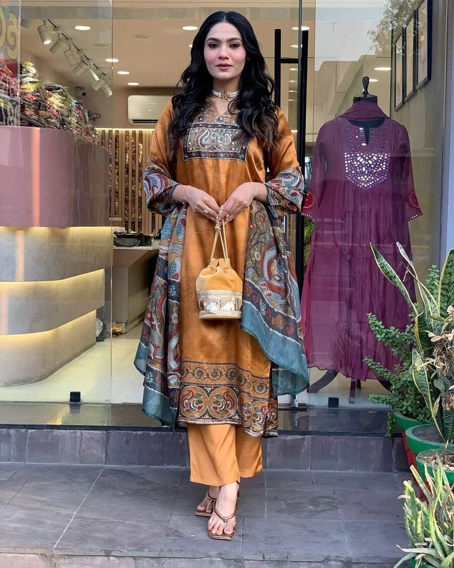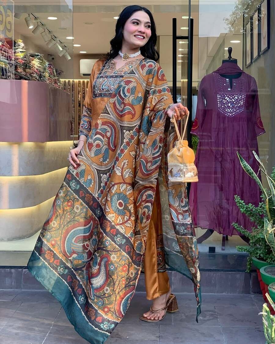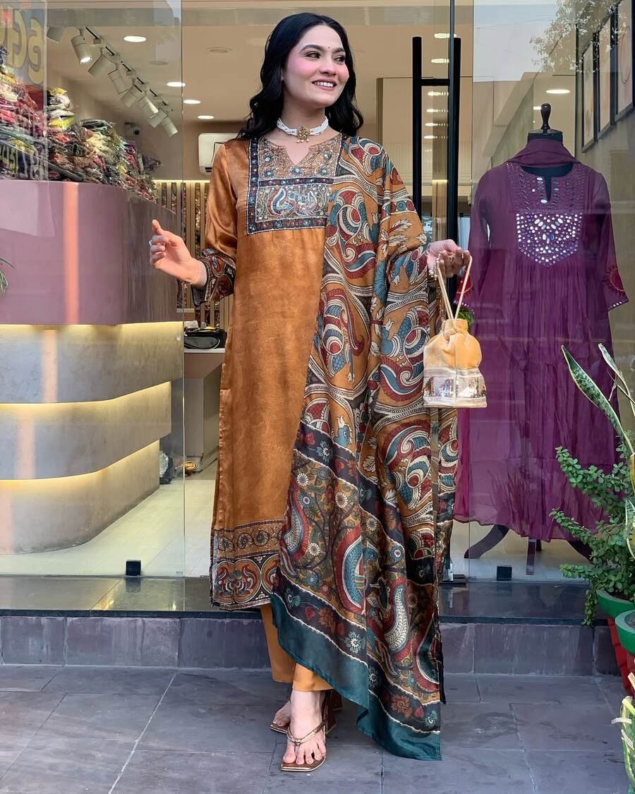 NEW ARRIVAL CHINON SILK DIGITAL PRINT WITH REAL MIRROR AND DIAMOND HANDWORK TOP BOTTOM WITH DUPATTA ORANGE