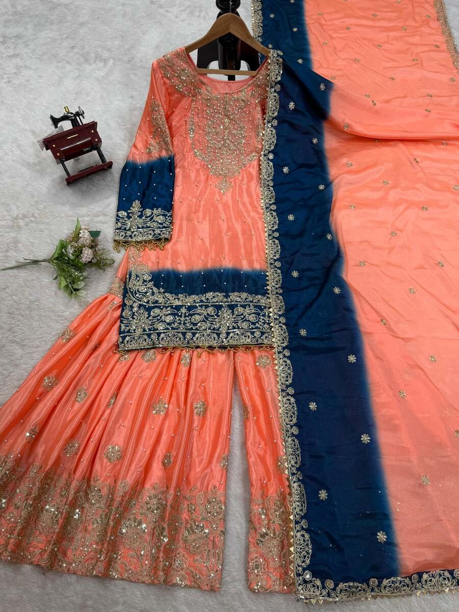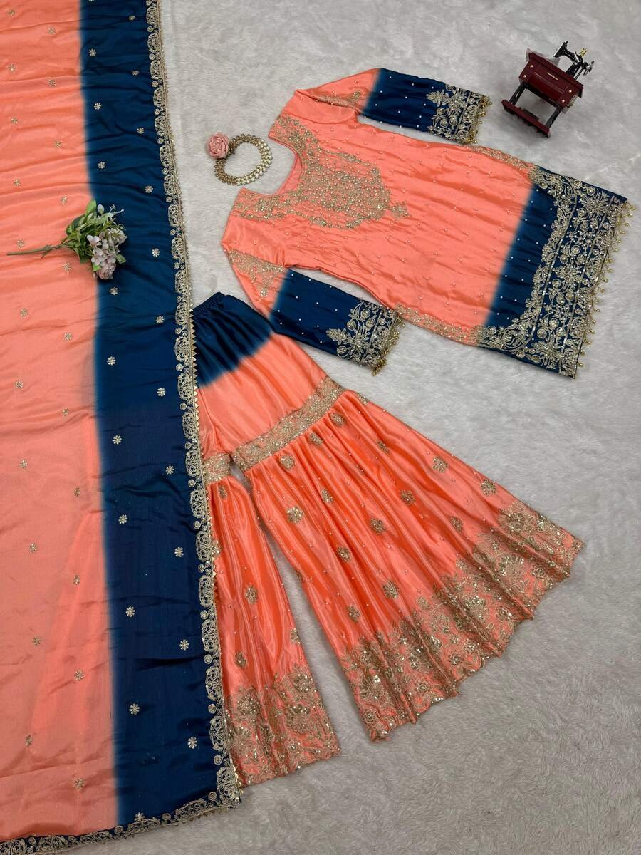 NEW ARRIVAL CHINON SILK EMBROIDERY CODING DORI SEQUENCE WORK TOP SHARARA WITH DUPATTA PEACH