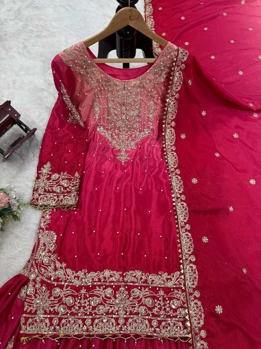 NEW ARRIVAL CHINON SILK EMBROIDERY CODING DORI SEQUENCE WORK TOP SHARARA WITH DUPATTA RANI
