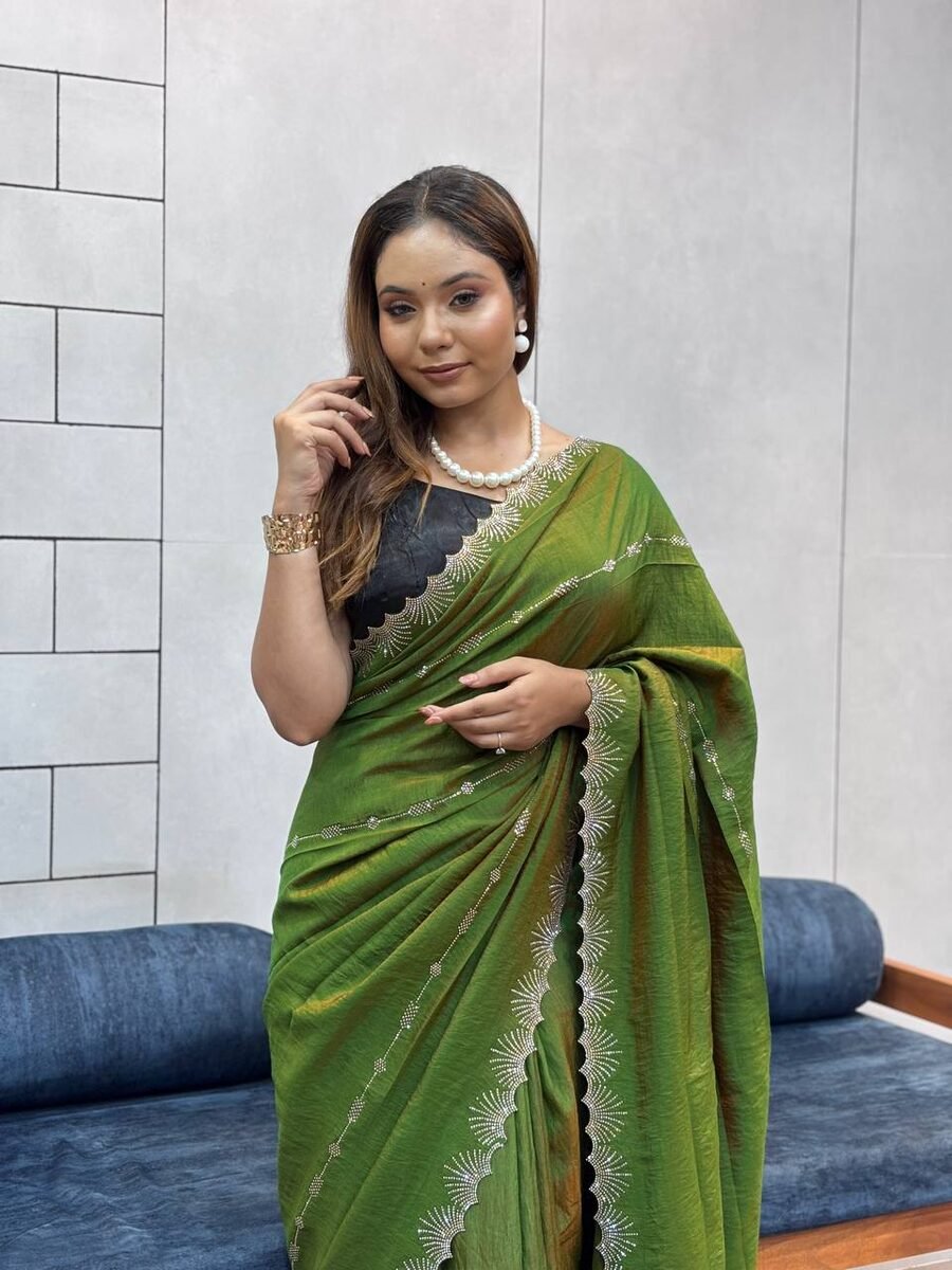 NEW ARRIVAL CHOCOLATE NC DAIMOND WORK WITH CUT WORK AND HAND WORK SAREE WITH UNSTITCHED BLOUSE GREEN