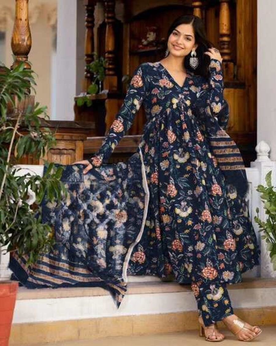 NEW ARRIVAL COTTON BLEND DIGITAL PRINTED TOP BOTTOM WITH DUPATTA NAVY BLUE