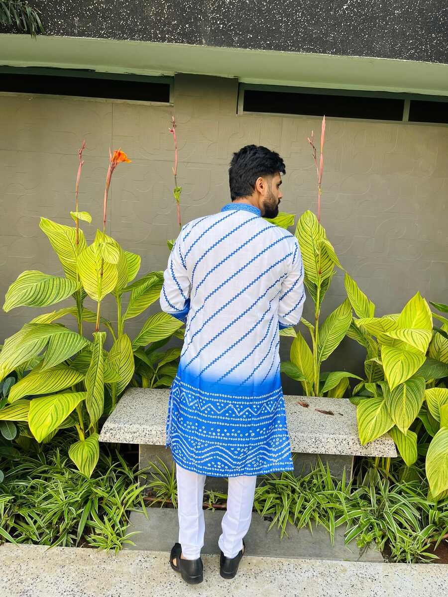 NEW ARRIVAL COTTON LEHERIYA PATTERN WITH BANDHNI DAMAN PRINT WORK MEN’S KURTA PAYJAMA BLUE