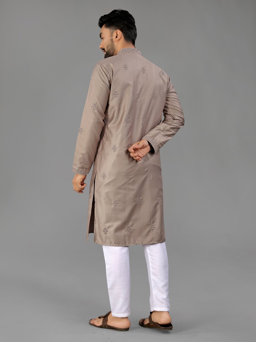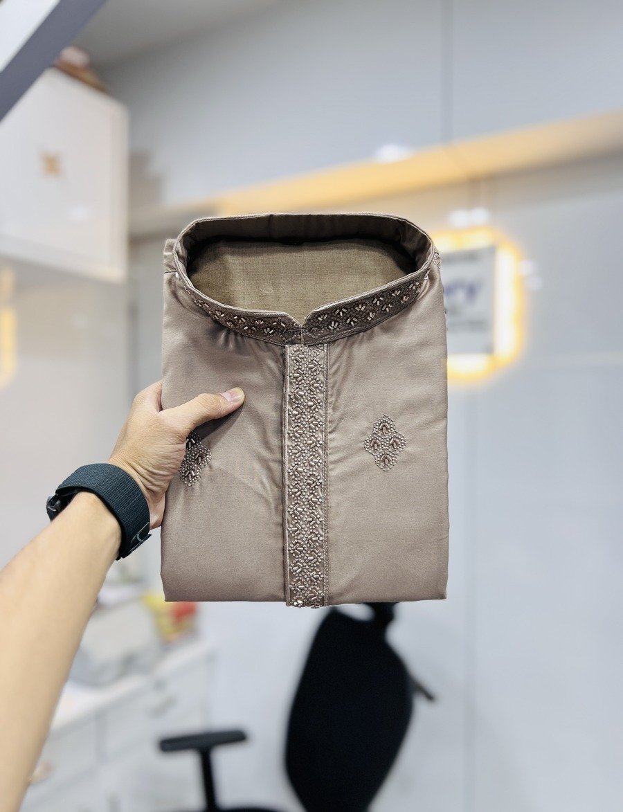 NEW ARRIVAL COTTON MATCHING VAL-MOTI BUTTA WORK MEN’S KURTA PAYJAMA BROWN