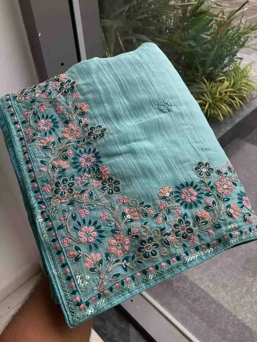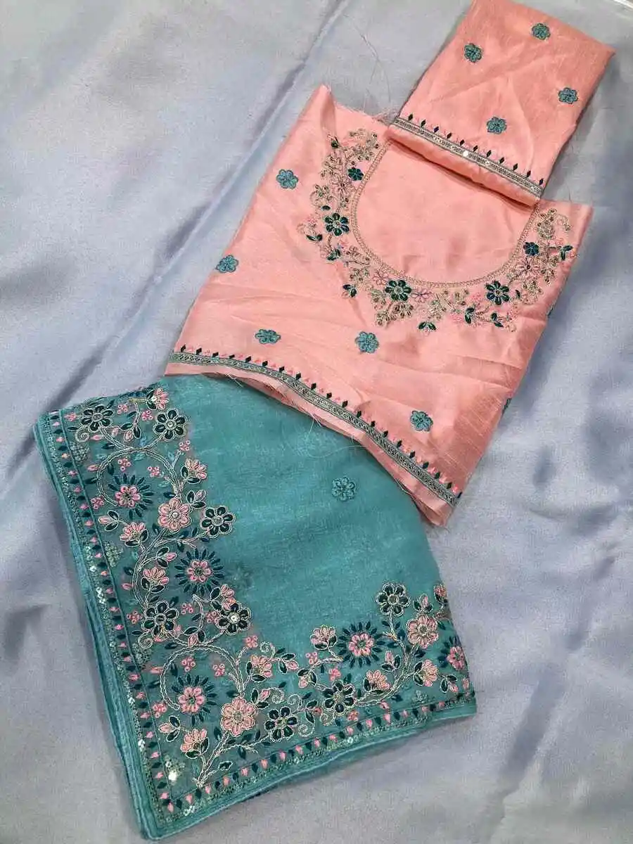 NEW ARRIVAL GEORGETTE CONTRAST PALLU EMBROIDERY WORK BORDER WORK SAREE WITH UNSTITCHED BLOUSE SKY