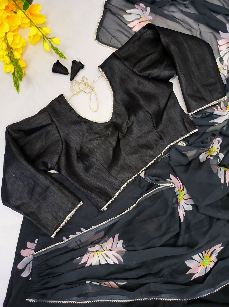 NEW ARRIVAL GEORGETTE DIGITAL PRINTED LEHENGA SAREE ATTATCHED DUPATTA WITH STITCHED BLOUSE BLACK