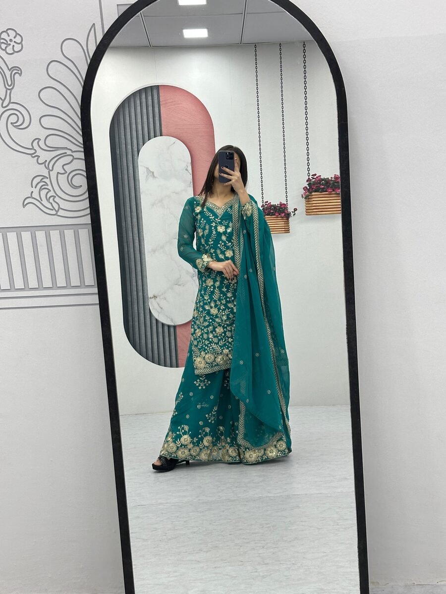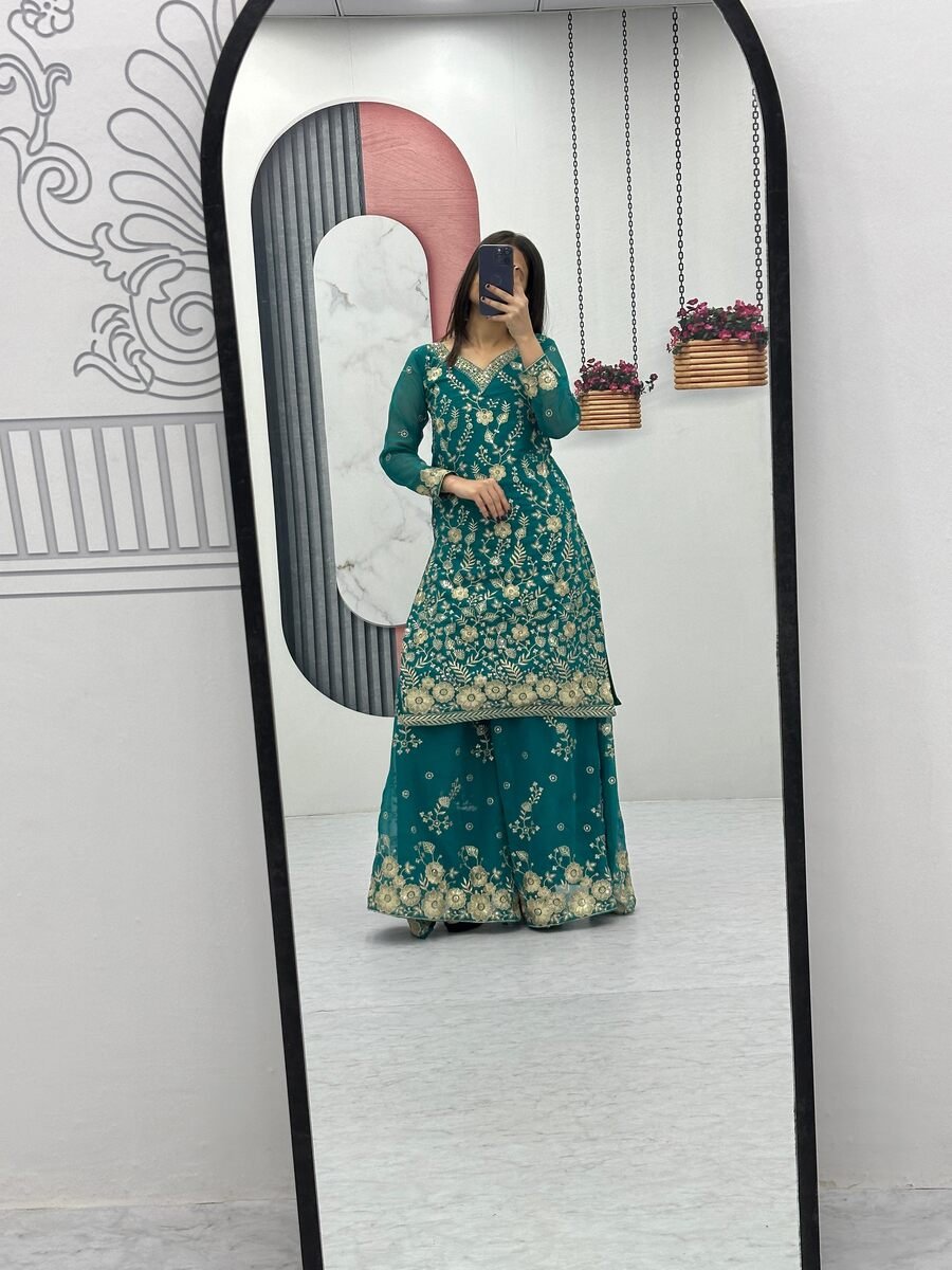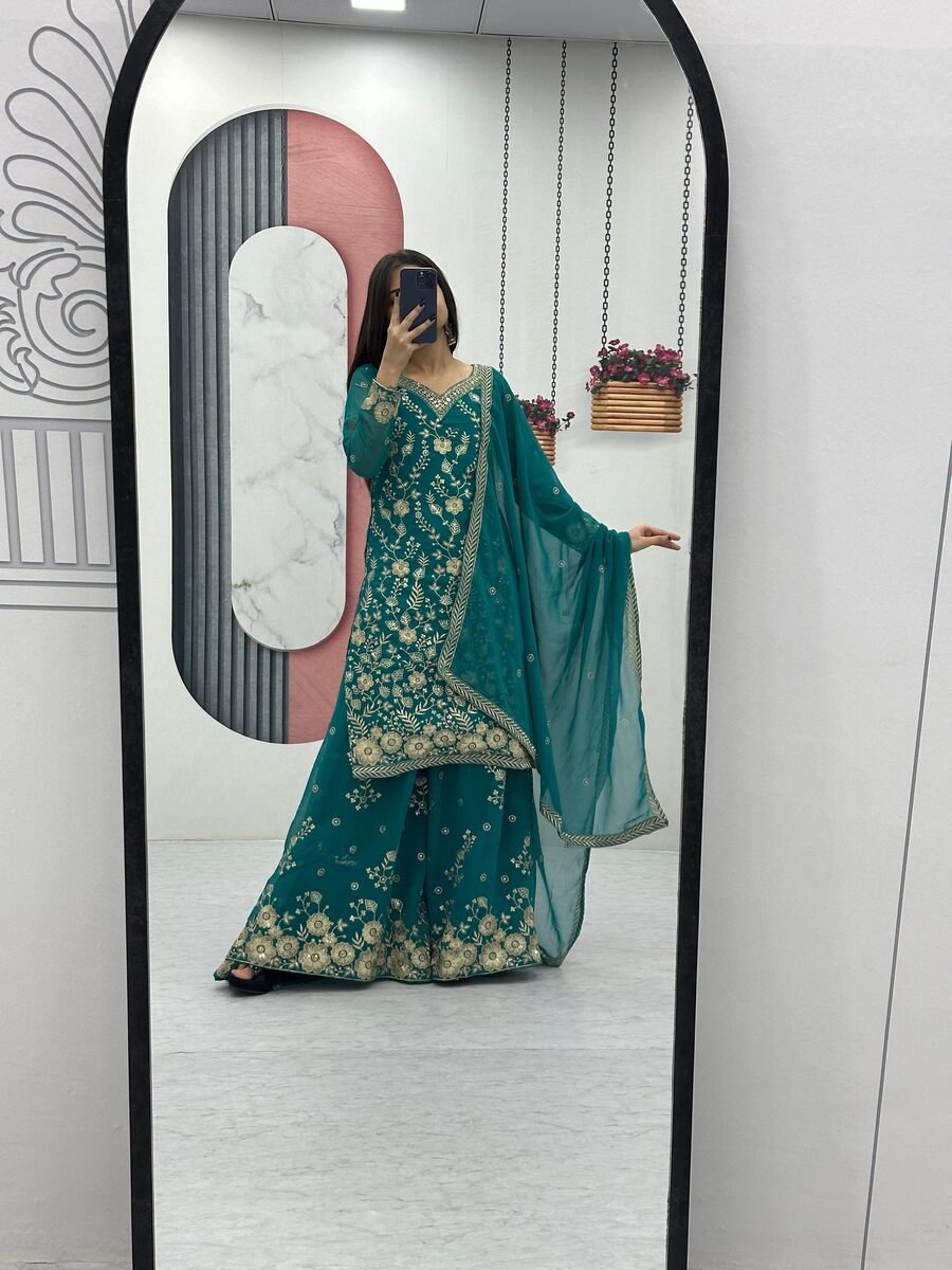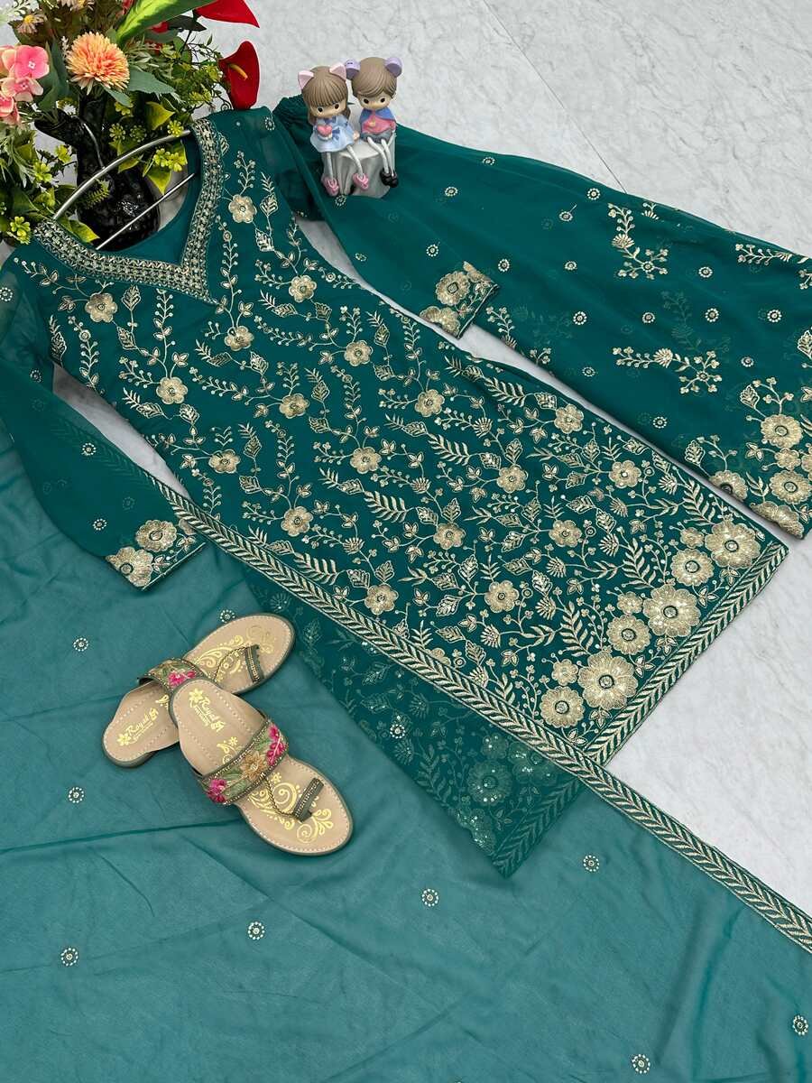FABRIC :- HEAVY FAUX GEORGETTE WITH HEAVY EMBROIDERY 3 MM SEQUENCE WORK WITH FANCY SLEEVES