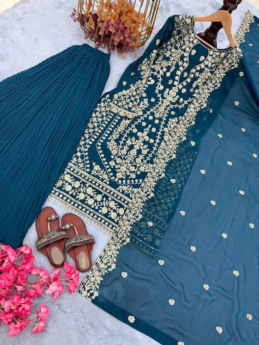 WORK : HEAVY EMBROIDERY 5 MM SEQUENCE WORK WITH RIVET MOTI WORK (SLEEVES WITH FANCY LATKAN BORDER)