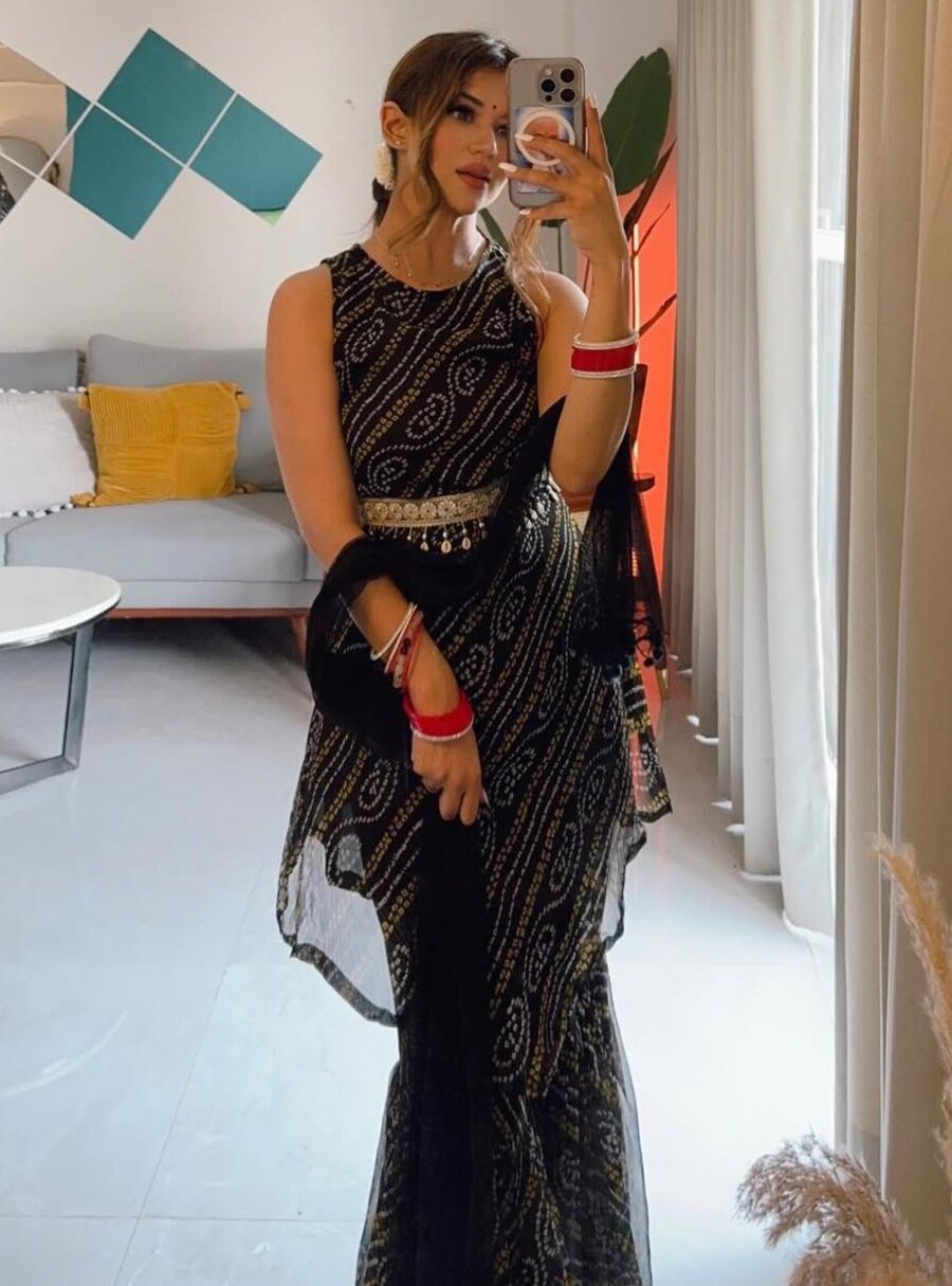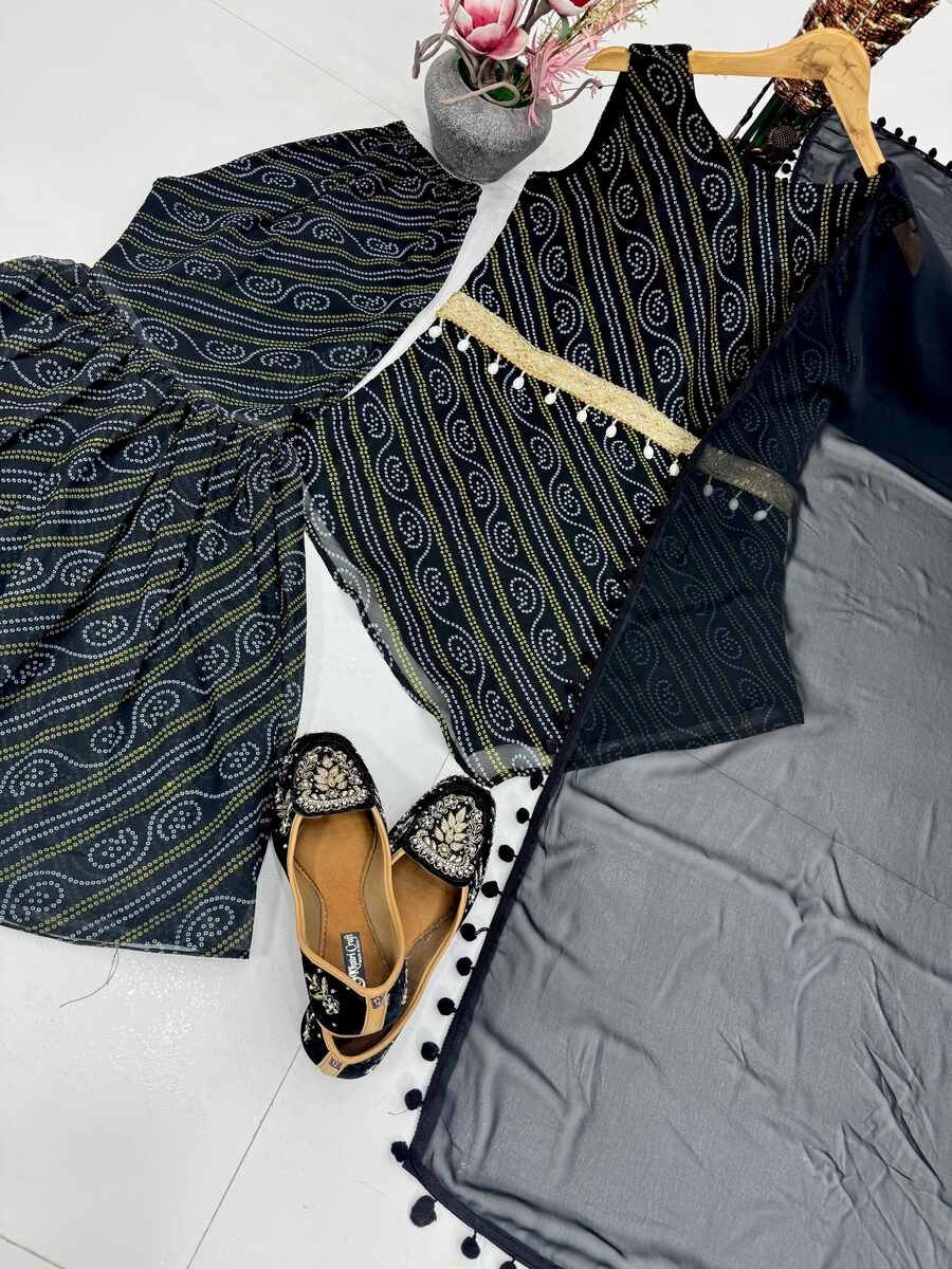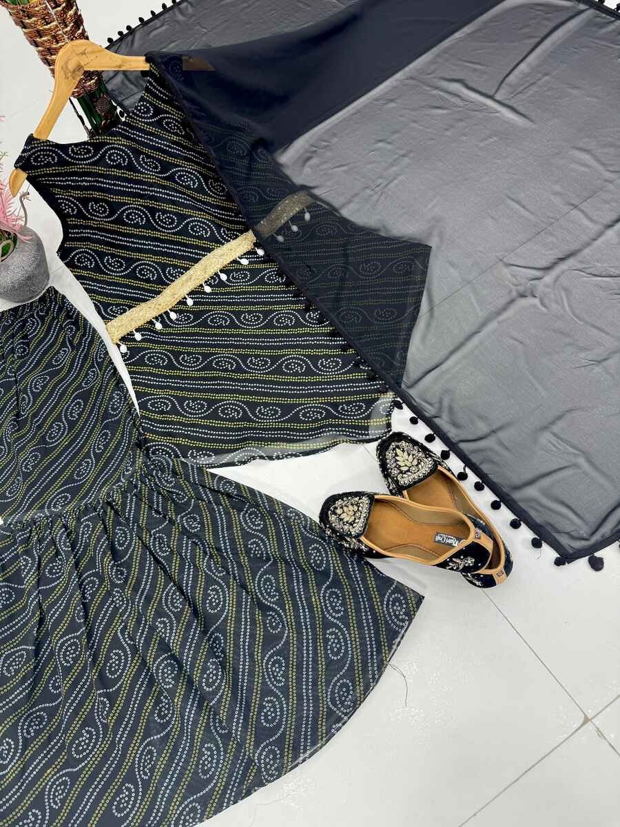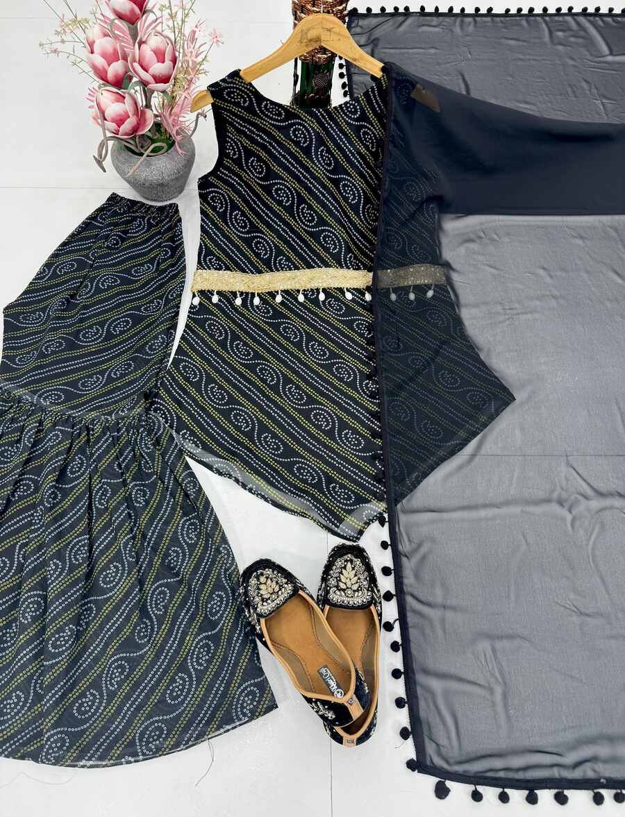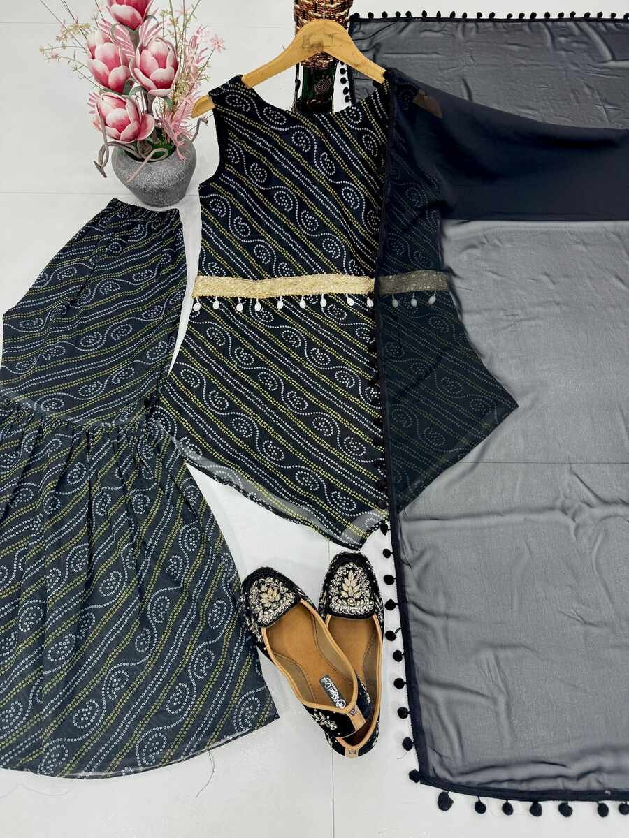 NEW ARRIVAL GEORGETTE FANCY DIGITAL PRINT WITH FANCY BELT WORK TOP SHARARA WITH DUPATTA BLACK