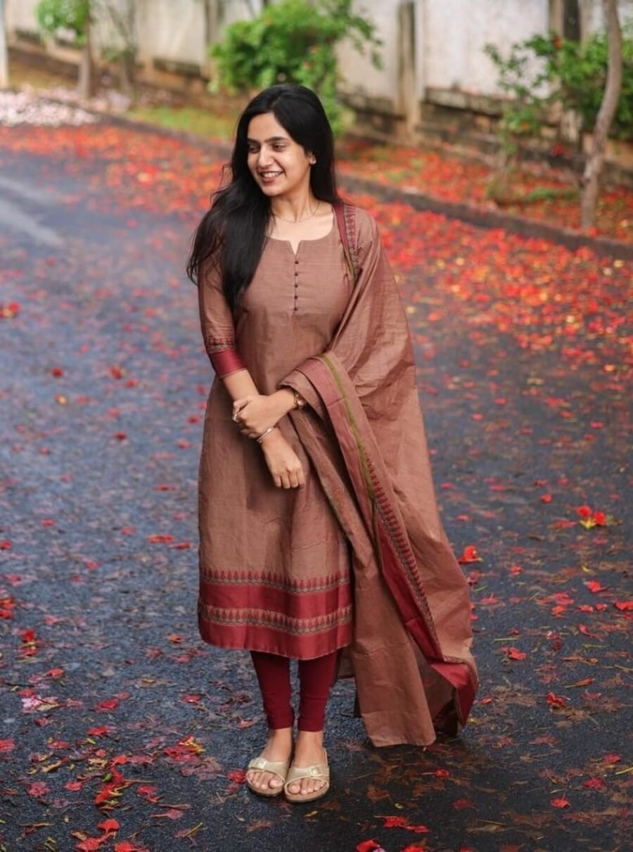 NEW ARRIVAL KANCHI COTTON ZARI WEAVING JACQUARD WORK TOP BOTTOM WITH DUPATTA BROWN