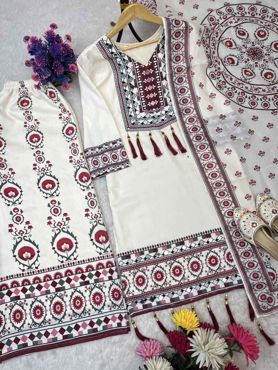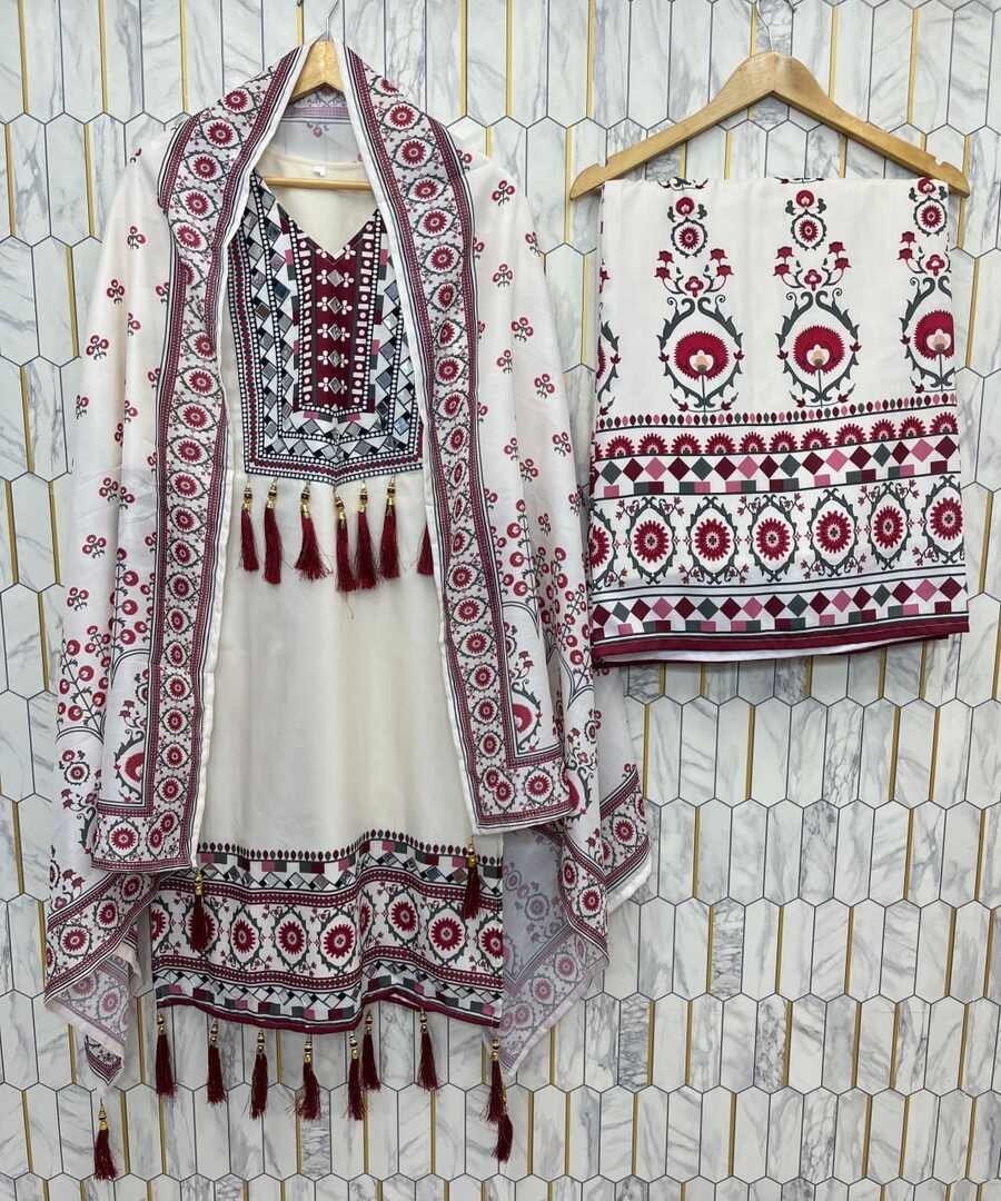 NEW ARRIVAL MUSLIN DIGITAL PRINT WITH LATKAN AND REAL MIRROR WORK TOP PALAZZO WITH DUPATTA OFF WHITE