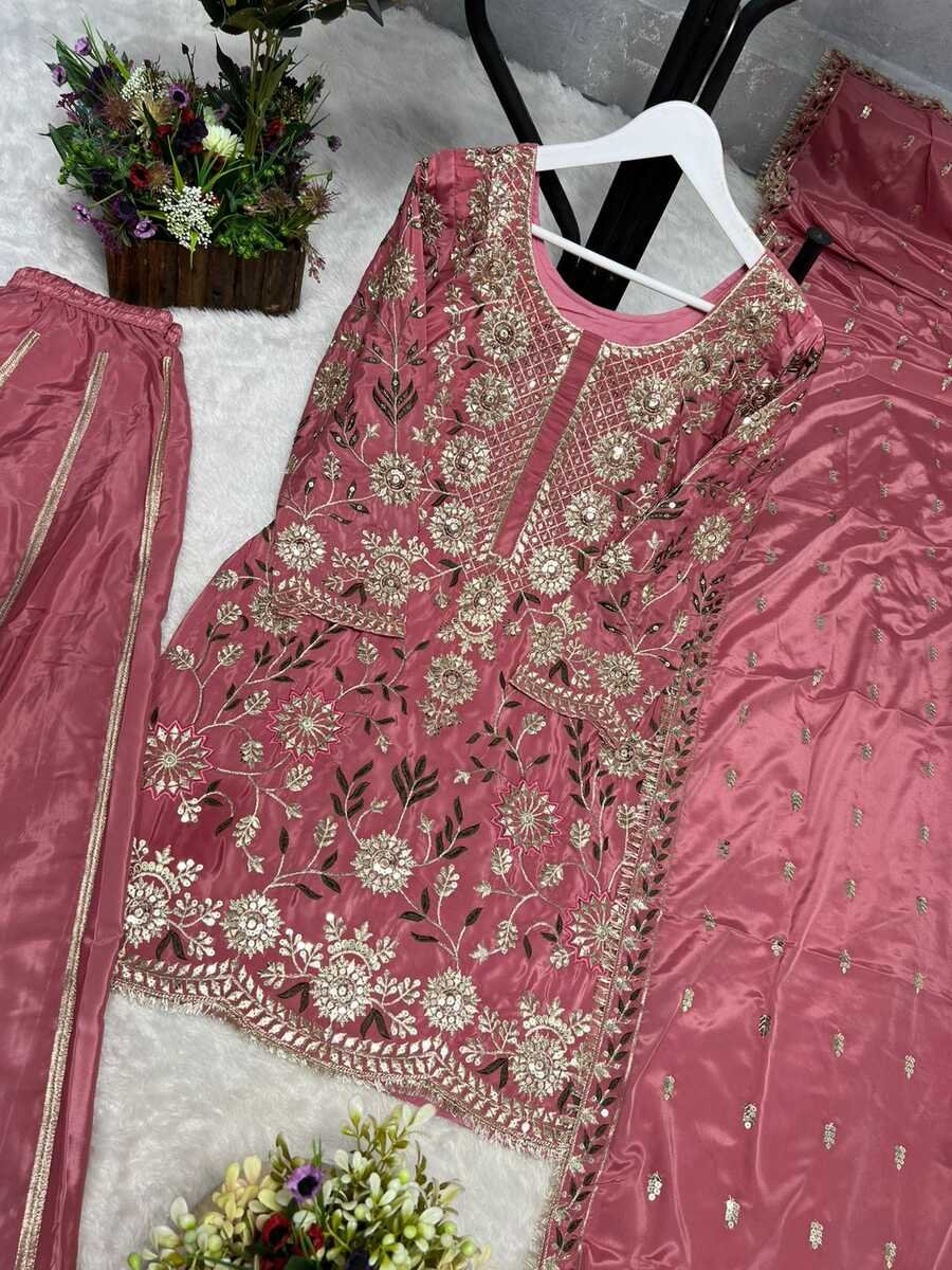 NEW ARRIVAL NATURAL CREPE EMBROIDERY AND SEQUENCE WORK TOP PALAZZO WITH DUPATTA PINK
