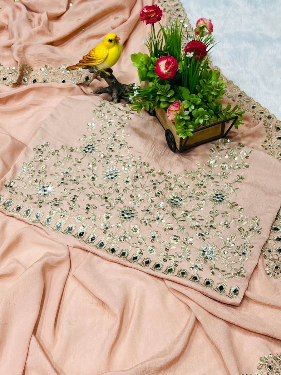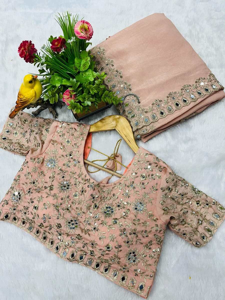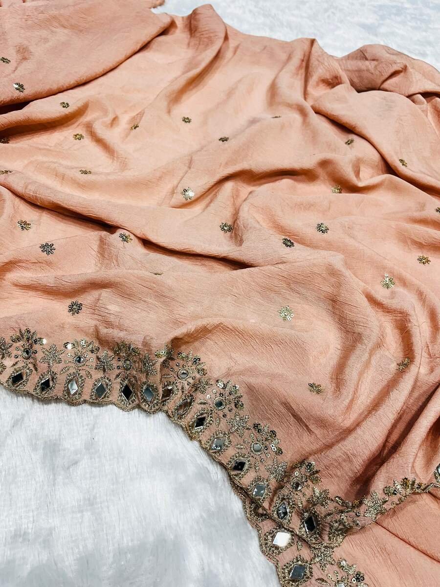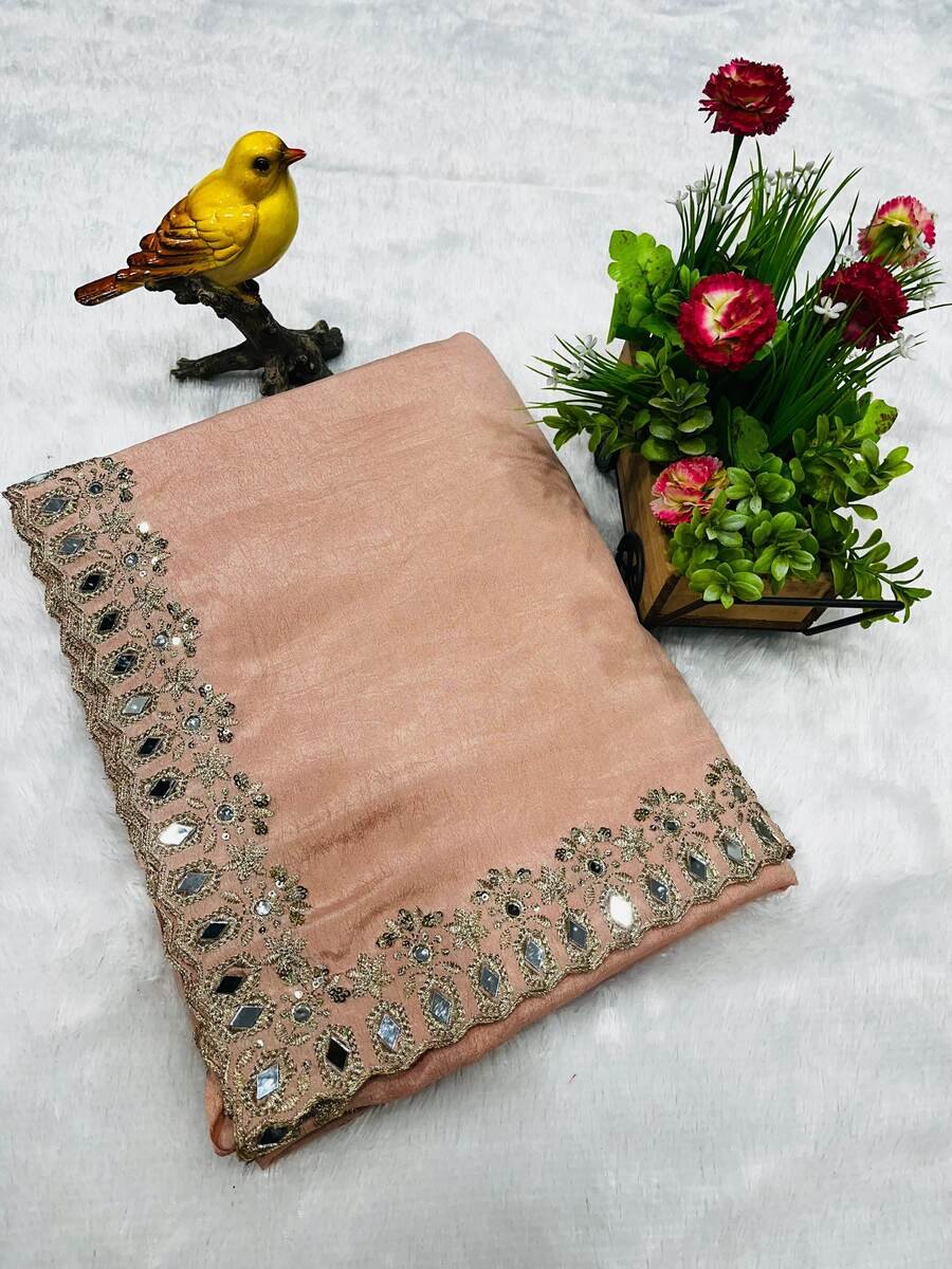 NEW ARRIVAL PLATINUM CRUSH ZARI DORI AND THREAD EMBROIDRY WIRH REAL MIRROR WORK SAREE WITH UNSTITCHED BLOUSE PEACH