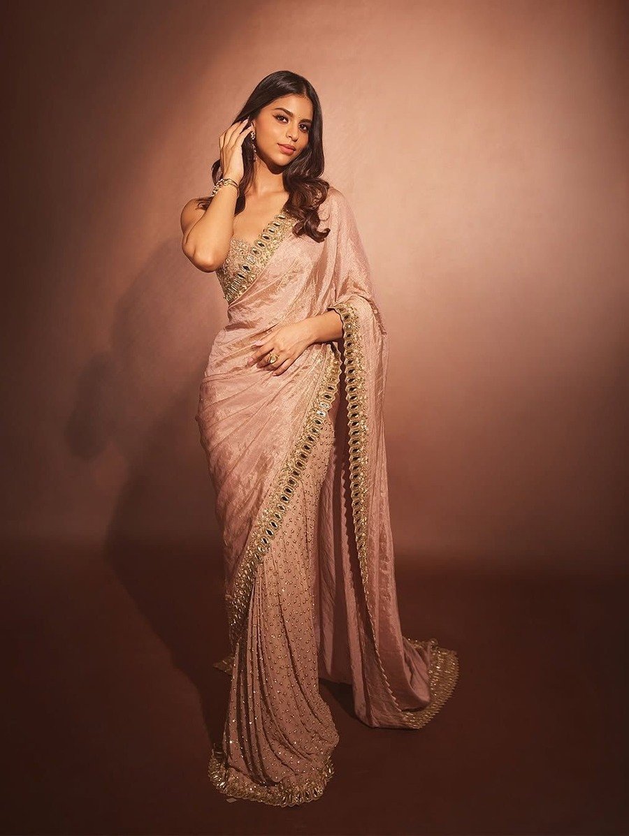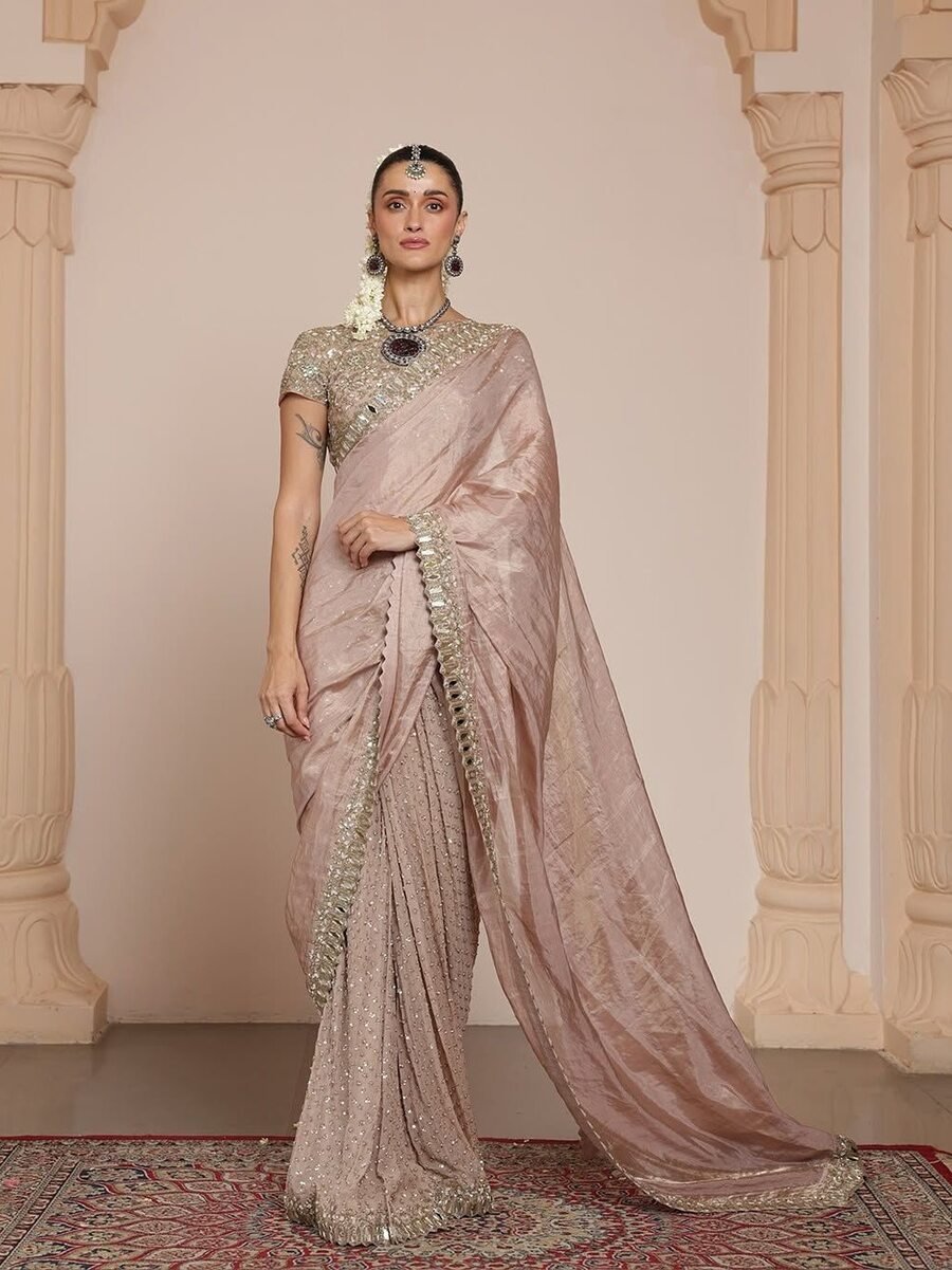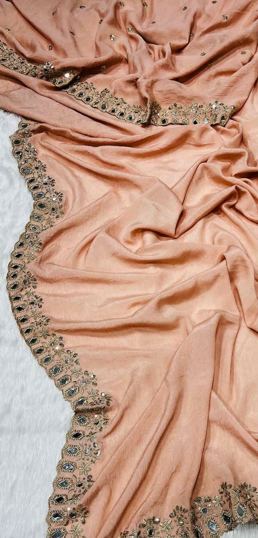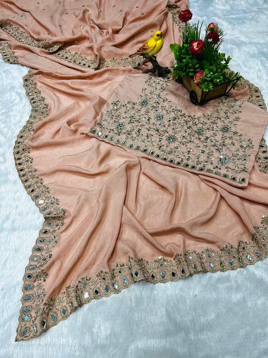 NEW ARRIVAL PLATINUM CRUSH ZARI DORI AND THREAD EMBROIDRY WIRH REAL MIRROR WORK SAREE WITH UNSTITCHED BLOUSE PEACH