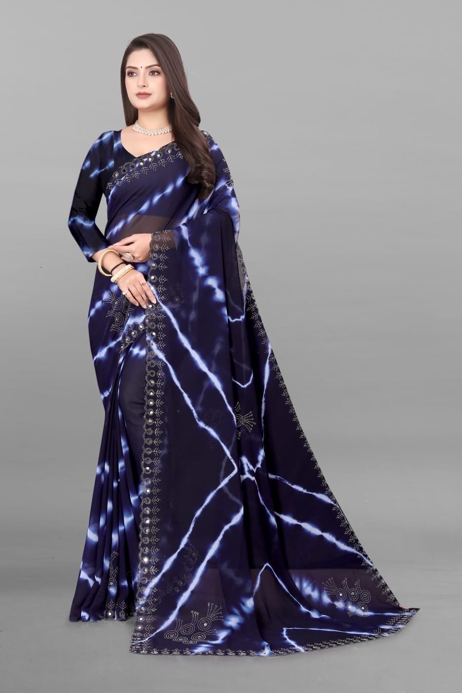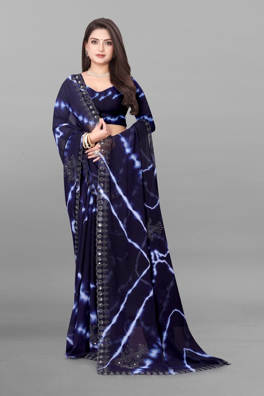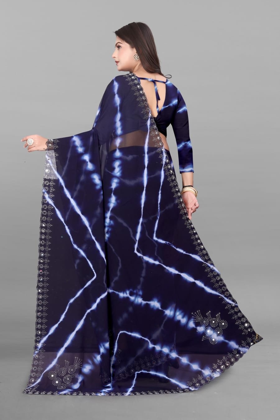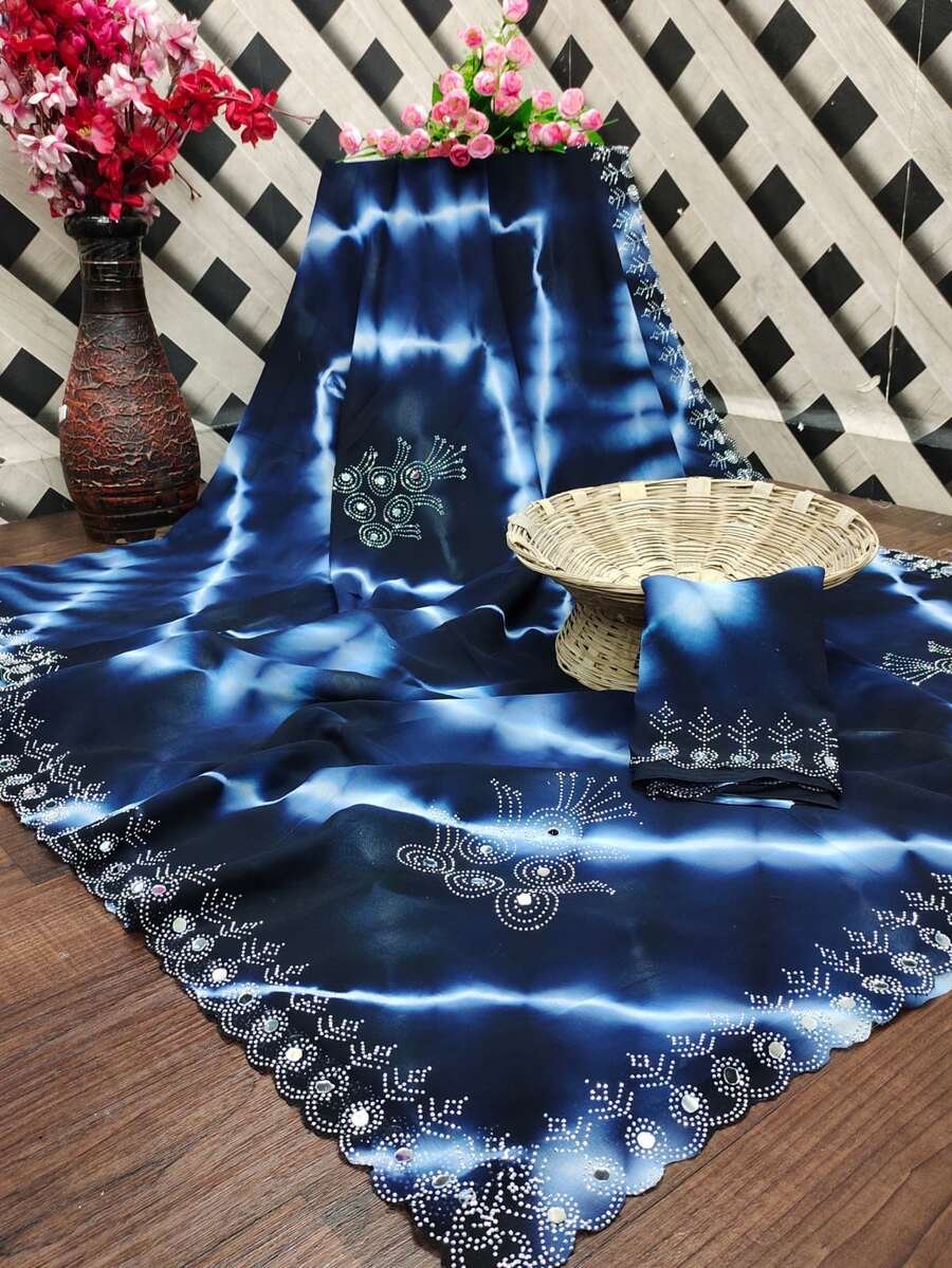 NEW ARRIVAL PURE VETLESS HOT FIX WORK SAREE WITH UNSTITCHED BLOUSE NAVY BLUE