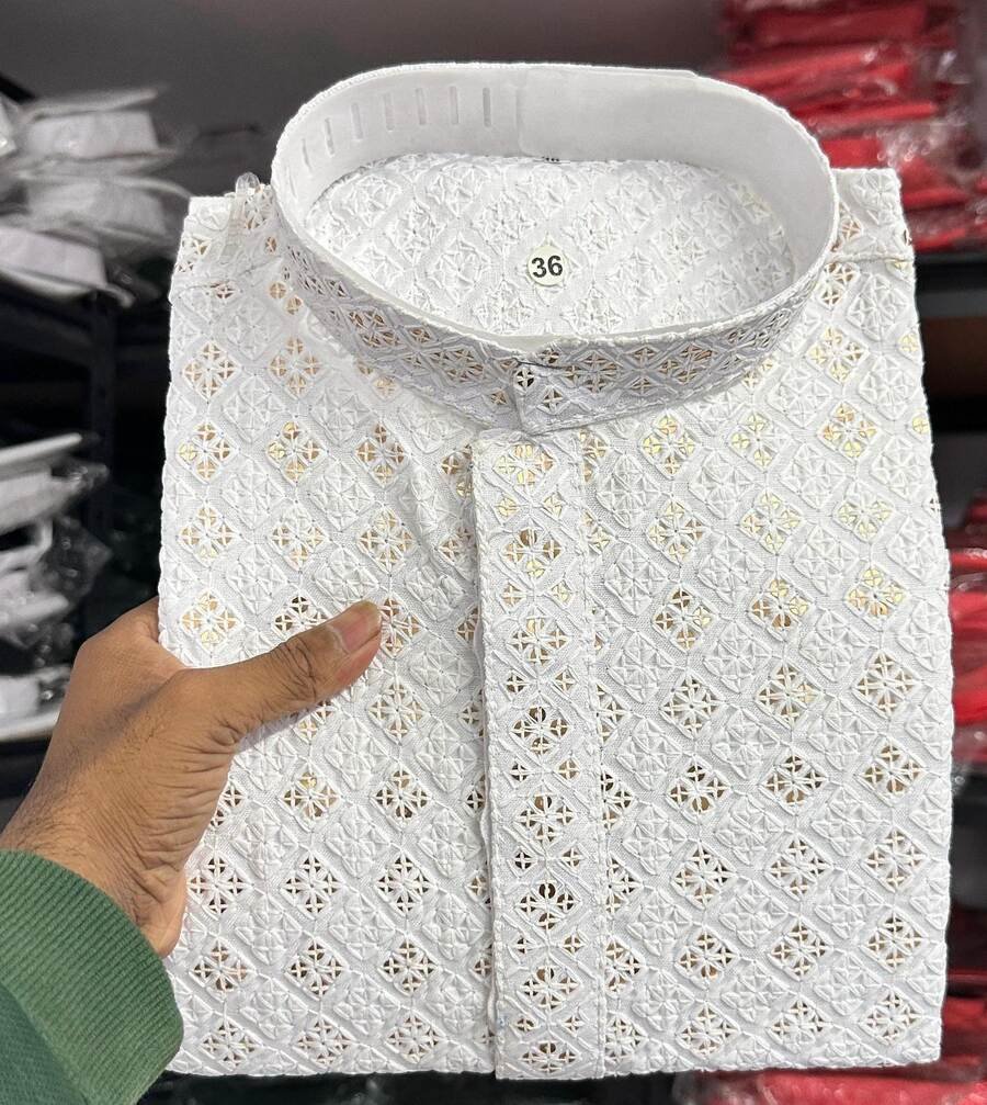 NEW ARRIVAL RAYON CHIKANKARI LUCKNOWI SCHIFLI WORK MEN’S KURTA PAYJAMA WHITE