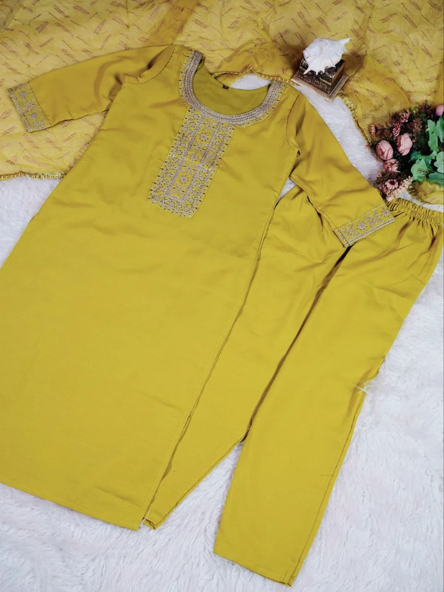 NEW ARRIVAL RAYON SLUB EMBROIDERY WORK TOP BOTTOM WITH DUPATTA LEMON