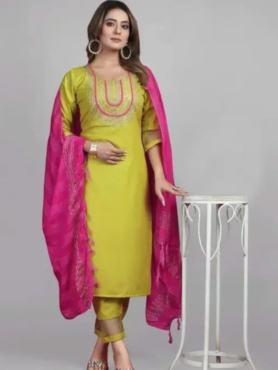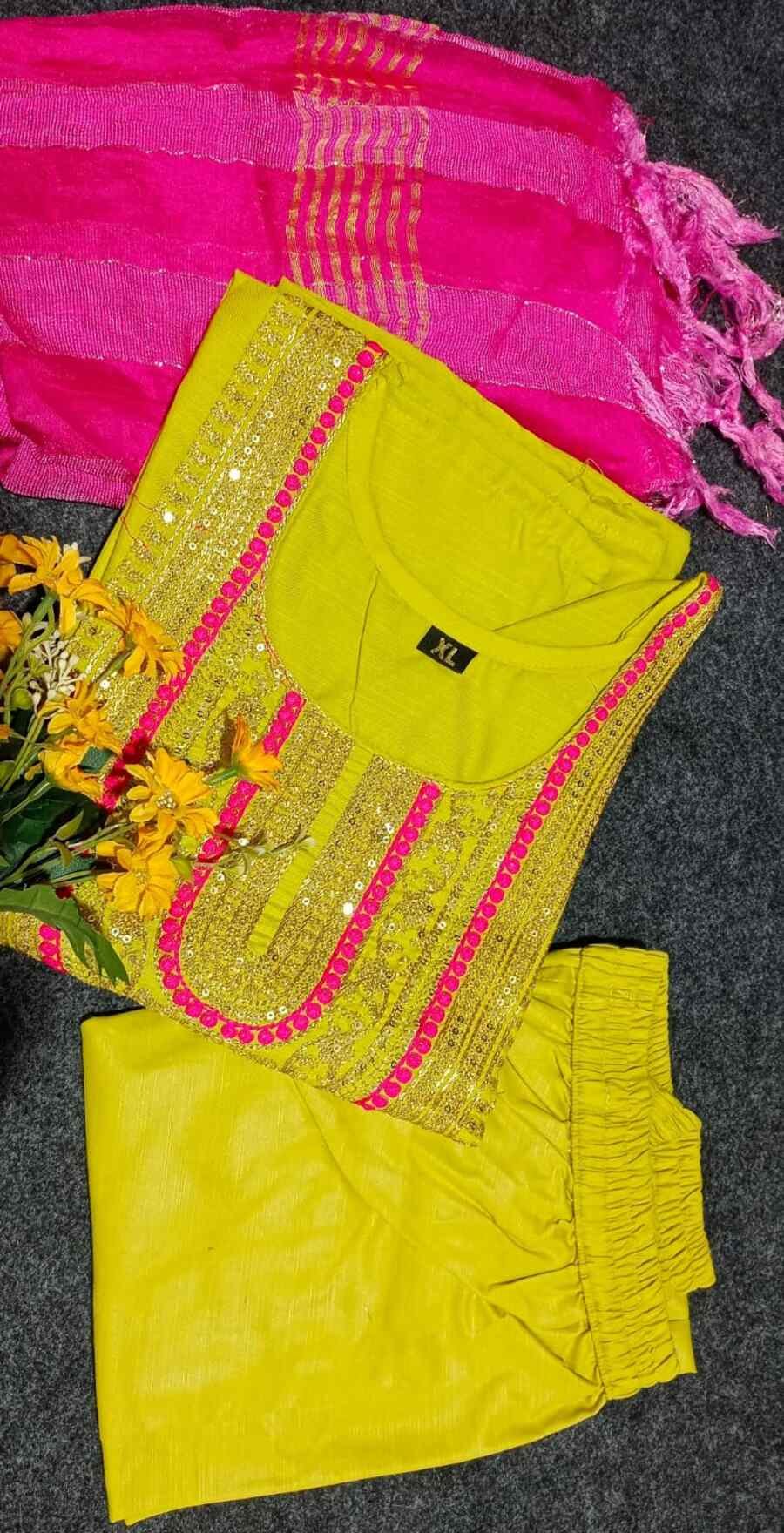 NEW ARRIVAL RAYON SLUB EMBROIDERY WORK TOP BOTTOM WITH DUPATTA LEMON