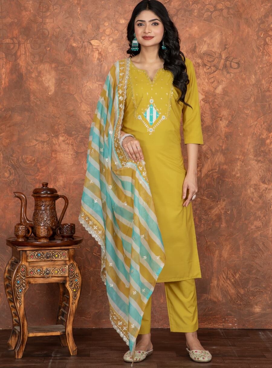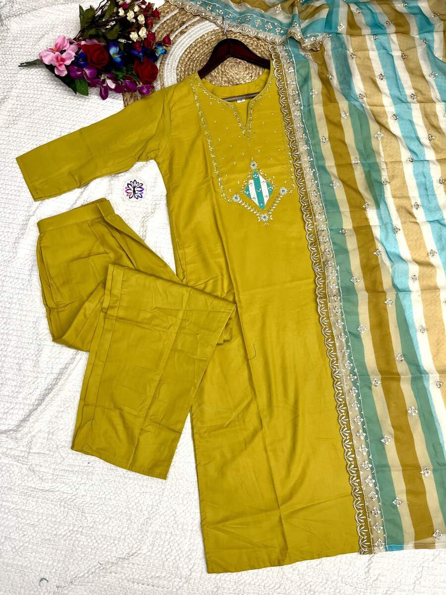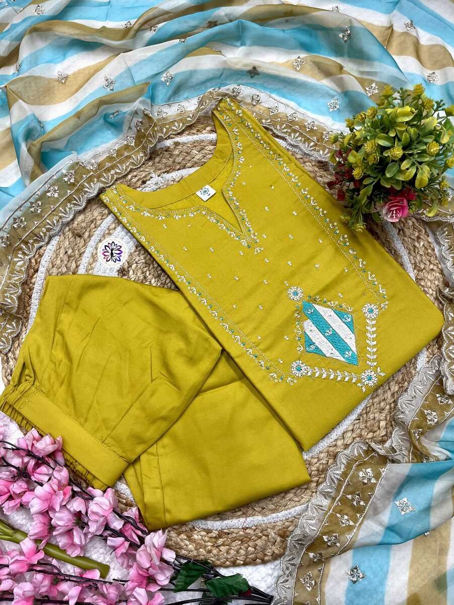 NEW ARRIVAL ROMAN SILK EMBROIDERY WORK TOP BOTTOM WITH DUPATTA YELLOW