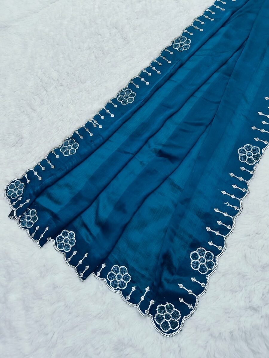 NEW ARRIVAL SATIN CHIFFON ZARKHAN AND MOTI FLOWERS BORDER WORK SAREE WITH UNSTITCHED BLOUSE BLUE